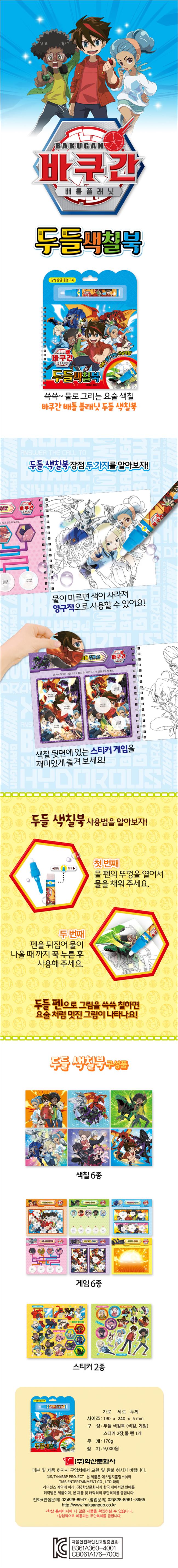 특수 인쇄로 제작되어 물을 이용해서 쓱쓱 색칠하는 두들색칠북. 붓이 아닌 펜을 이용해서 선과 면을 보다 효과적으로 색칠할 수 있다. 물감, 색연필이 필요 없어 휴대가 간편하다. 특수 인쇄면의 먹라인을 따라 아이가 선과 면을 나누어서 칠할 수 있으며 운필력과 색채 감각을 동시에 키울 수 있다. 물기가 마르면 다시 원상태로 돌아가기 때문에 아이가 반복적으로 색칠을 할 수 있어 매우 경제적인 제품이다.