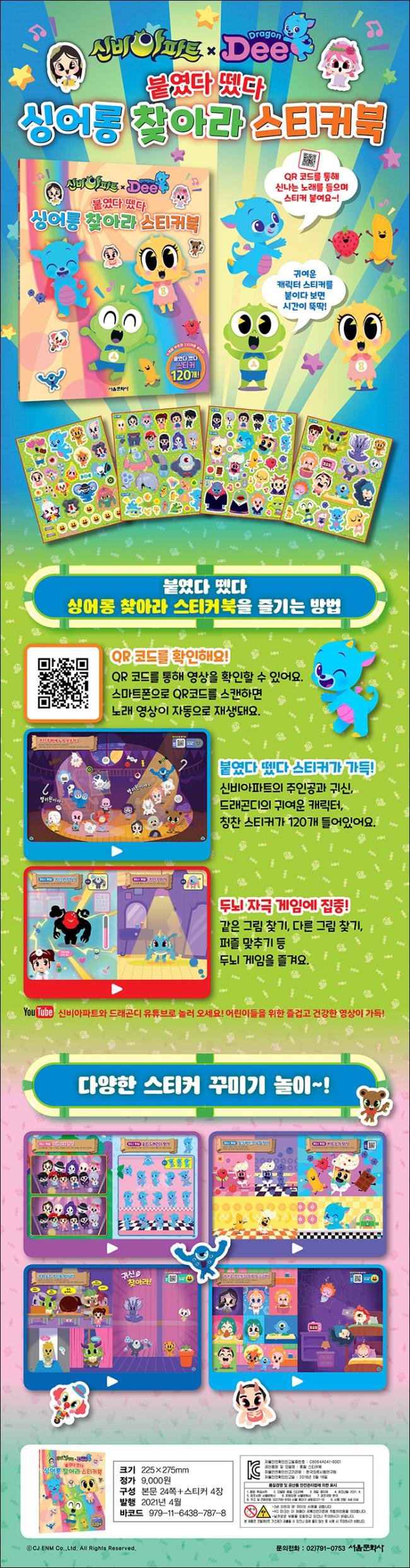 스티커를 계속 붙였다 뗐다 할 수 있어, 다양한 놀이 활동도 가능해요. 즐겁고 신나는 <신비아파트X드래곤디 붙였다 뗐다 싱어롱 찾아라 스티커북>! 소근육 발달과 함께 영유아의 상상력과 창의력이 쑥쑥 자라납니다.