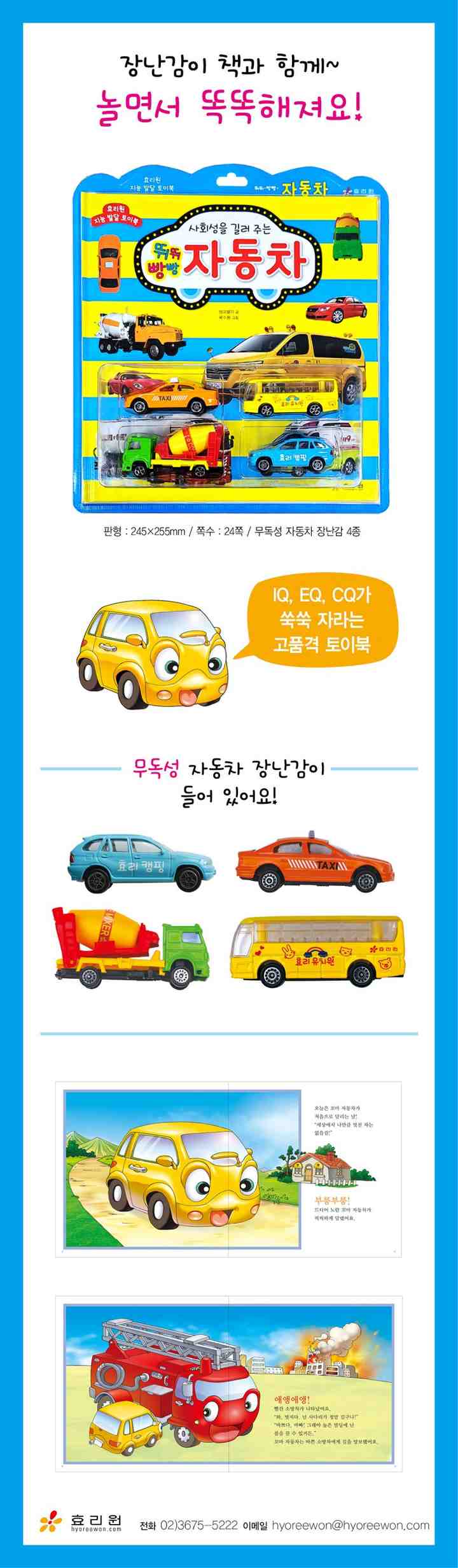 아이들이라면 누구나 좋아하는 장난감! 하지만 장난감만 찾는 아이에게 좋은 책을 선물하고 싶은 것이 엄마아빠의 마음 아닐까요? ㈜효리원의 『지능 발달 토이북 시리즈』는 이야기책과 장난감을 함께 만나 볼 수 있는 세트 상품입니다. 자동차, 소방차, 공룡, 동물, 곤충 등 아이들이 좋아하는 장난감과 흥미진진한 이야기, 아기자기한 그림, 또는 사진이 담긴 책으로 구성되어 있습니다. 재미있는 이야기를 읽으며 지식을 쌓고, 장난감을 가지고 놀면서 관찰력, 인지력, 상상력을 키워요!