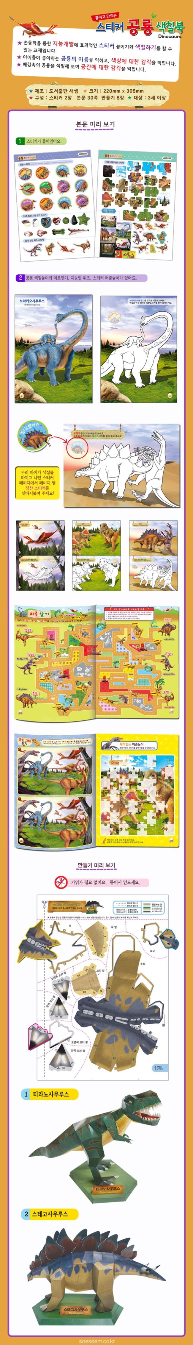 지능 개발에 효과적인 손동작을 이용한 스티커 붙이기와 색칠하기를 할 수 있는 교재다. 놀이를 통해 자연스럽게 공룡의 이름을 익히고, 색상에 대한 감각, 배경 속의 공룡 도안을 색칠하며 자연스럽게 공간에 대한 감각을 익힐 수 있다.