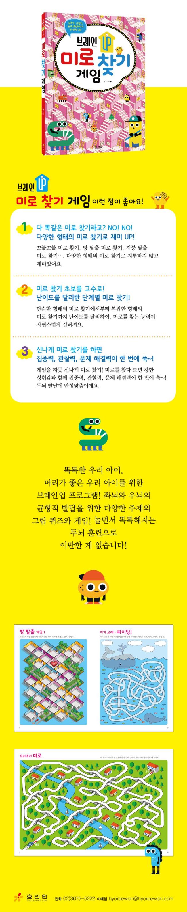꼬불꼬불 미로 찾기, 방 탈출 미로 찾기, 지붕 탈출 미로 찾기 등 다양한 형태의 미로 찾기로 지루하지 않고 재미있다. 단순한 형태의 미로 찾기에서부터 복잡한 형태의 미로 찾기까지 난이도를 달리하여, 미로를 찾는 능력이 자연스럽게 길러진다. 미로 찾기를 하면 강한 성취감과 함께 집중력, 사고력, 관찰력이 향상된다.