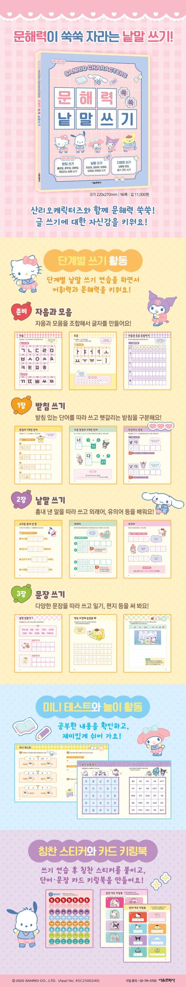 공부한 날짜를 적고 산리오캐릭터즈 칭찬 스티커를 붙이면서 스스로 공부하는 방법을 배울 수 있어요. 숨은 낱말 찾기, 다른 그림 찾기 등 재미있는 놀이 활동도 준비되어 있어요.