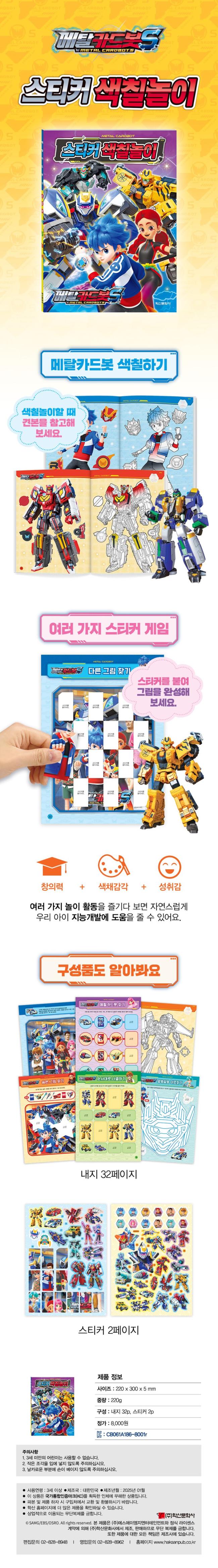 색칠,스티커 놀이와 재미있는 게임을 통해 아이들의 지능을 향상시키는 스티커 색칠놀이. 다양한 캐릭터를 색칠하면 소근육 활동량이 늘어나 집중력과 창의력이 발달된다. 손과 눈의 협응력을 길러주며 자연스럽게 형태와 색채의 감각을 익힐 수 있다. 스티커놀이와 다양한 게임을 통하여 복합적인 사고력과 응용력을 키울 수 있다.
