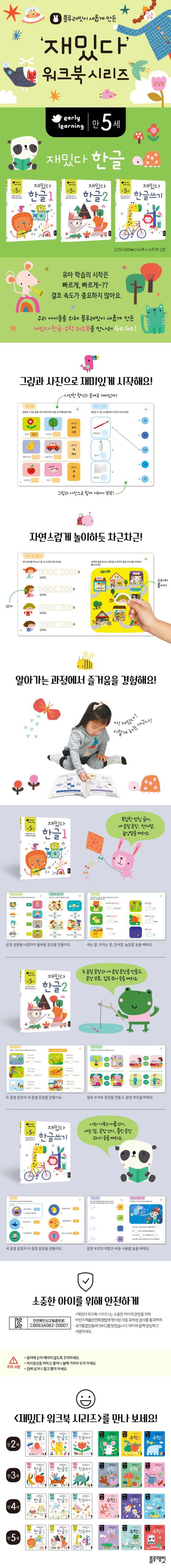 <재밌다 워크북 시리즈>는 소중한 아이의 안전을 위해 어린이제품안전특별법에 명시된 각종 유해성 검사를 통과하여 국가통합인증마크(KC)를 받았습니다. 아이와 함께 안심하고 사용하세요.