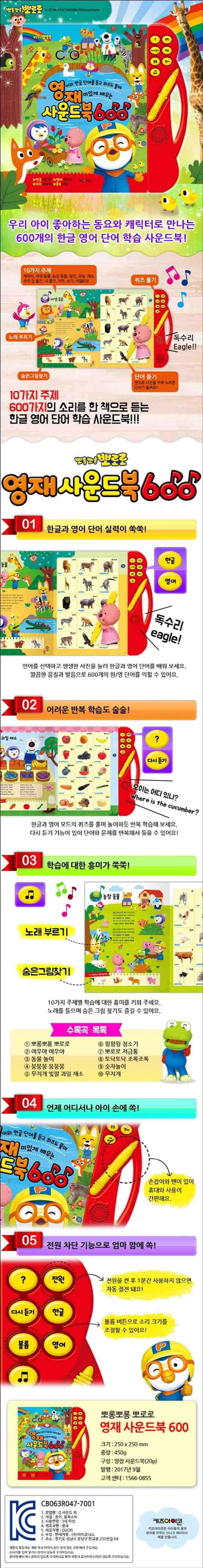 『뽀로로 영재사운드북 600』은 우리 아이가 좋아할 동요와 캐럭터로 600개의 한글 영어 단어 학습이 가능한 도서입니다. 한글과 영어 단어 실력 향상에 도움을 주고 어려운 반복 학습 및 학습에 대한 흥미도 키울 수 있어요.