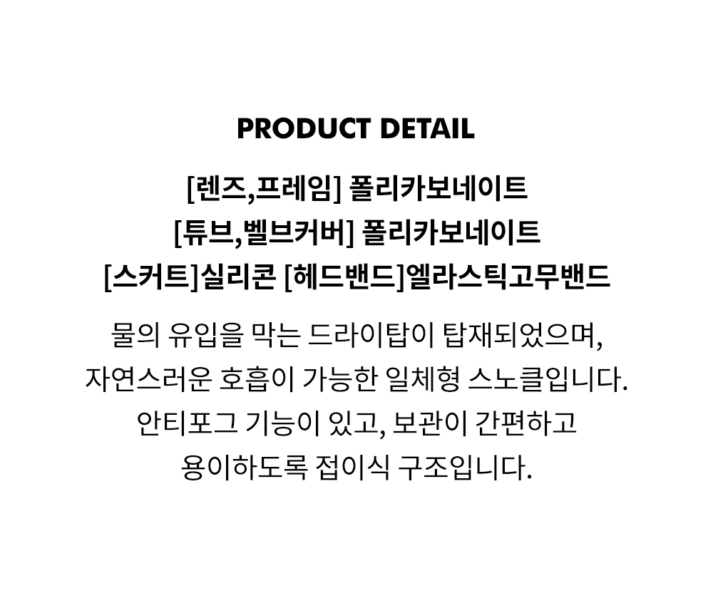 [렌즈,프레임] 폴리카보네이트 [튜브,벨브커버] 폴리카보네이트 [스커트] 실리콘 [헤드밴드] 엘라스틱고무밴드