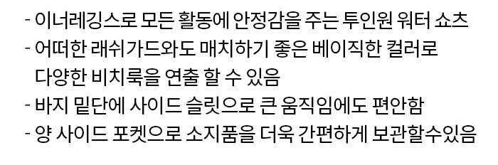 단독세탁,단독보관, 1.세탁시에는 수영복을 충분히 흔들어 가볍게 짠 후 그늘에서 말리십시오(세탁기,탈수기사용불가 및 비벼빨지마십시오) 2. 수영복 원단은 마찰에 의해 보풀이 일어날 수있으니 주의하십시오. 3. 특히 엘라스틱밴드는 뜨거운 물 혹은 다림질에 의해 늘어지므로 주의하십시오. 4. 염소계, 산소계 제품의 표백제는 사용하지 마십시오."&" 5.물에 오래 담가두거나 세탁 후 그대로 놓아두면 오염이 될 수 있으니 곧 탈수 및 건조시켜 주십시오. 6.온탕 및 온천, 스타시에 착용하지 마십시오. 탈색, 변색, 이염, 오염 등의 원인이 됩니다. 7. 원단 특성상 모래가 낄 수있으니 주의하십시오. 8 오일 썬크림 미끄럼틀 이용이 제품손상의 원인이 될 수 있습니다.