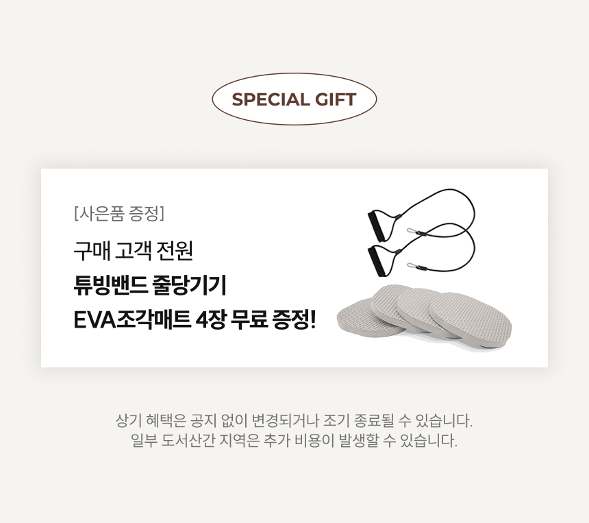 [사용 편의성] - 완제품으로 배송되어 별도의 조립 과정 없이 바로 운동을 시작할 수 있습니다. - LCD 계기판으로 횟수, 시간, 칼로리 등 운동 정보를 실시간으로 확인됩니다. - 앞뒤 지지대의 수평 조절 장치로 고르지 않은 바닥에서도 사용이 유리합니다. - 기본 제공되는 튜빙밴드를 연결하여 상체 운동을 함께 진행할 수 있습니다.
