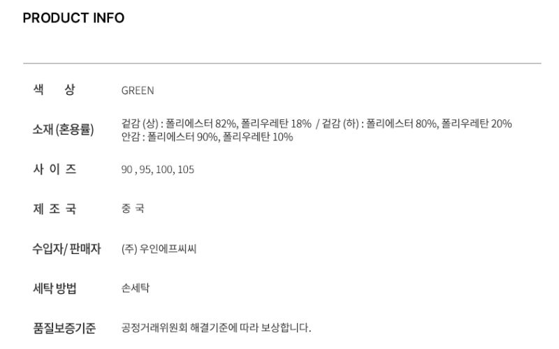 제품소재 : 겉감 폴리에스터 82 폴리우레탄 18 안감 B 폴리에스터 90 폴리우레탄 10