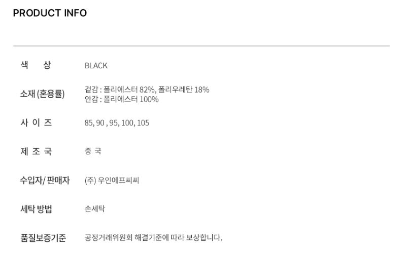 제품소재 : 겉감 폴리에스터 82 폴리우레탄 18 안감 폴리에스터 100