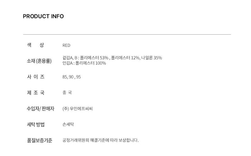 제품소재 : 겉감 A B 폴리에스터 53 폴리에스터 12 나이론 35 안감 A 폴리에스터 100