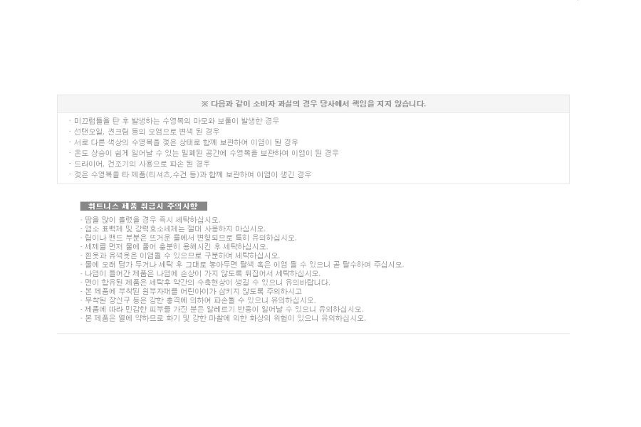 세탁방법 및 취급시 주의사항 : [수영복 제품취급시 주의사항]1. 수영장의 염소 성분으로 인하여 변색될 우려가 있으니 사용후에는 맑은물로 헹구어주십시오.2. SPANDEX 는 마찰에 약하므로 미끄럼등의 심한 마찰에 주의하십시오.3. 특히 ELASTIC BAND 는 뜨거운 물 혹은 다림질에 의해 늘어지므로 주의하십시오.4. 염소계 또는 산소계 제품의 표백제는 사용하지 마십시오.5. 본 제품과 다른 세탁물과 같이 세탁하지 마십시오.6. 물에 오래 담가두거나 세탁후 그대로 놓아두면 이염될 수 있으니 곧 탈수 건조시켜 주십시오.7. 수영복에 큰 마찰을 주는 미끄럼틀은 수영복의 파손을 초래합니다. 이 경우 소비자 과실로 교환,환불이 불가합니다.8. 썬탠용 오일은 고무를 상하게 합니다. 수영복에 썬탠용 오일이 닿지 않도록 주의바랍니다.9. 젖은 상태로 타상품과 보관시 이염이 될 수 있으므로 단독보관 바랍니다.10. 위의 경우로 불량 발생시 당사에서는 책임을 지지 않습니다.