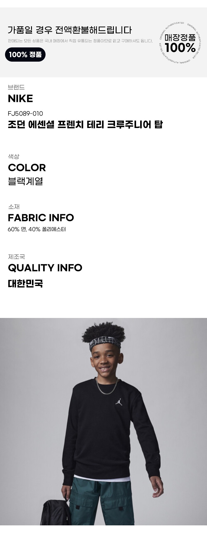 키즈긴팔티 FJ5089-010 조던 에센셜 프렌치 테리 크루주니어 탑