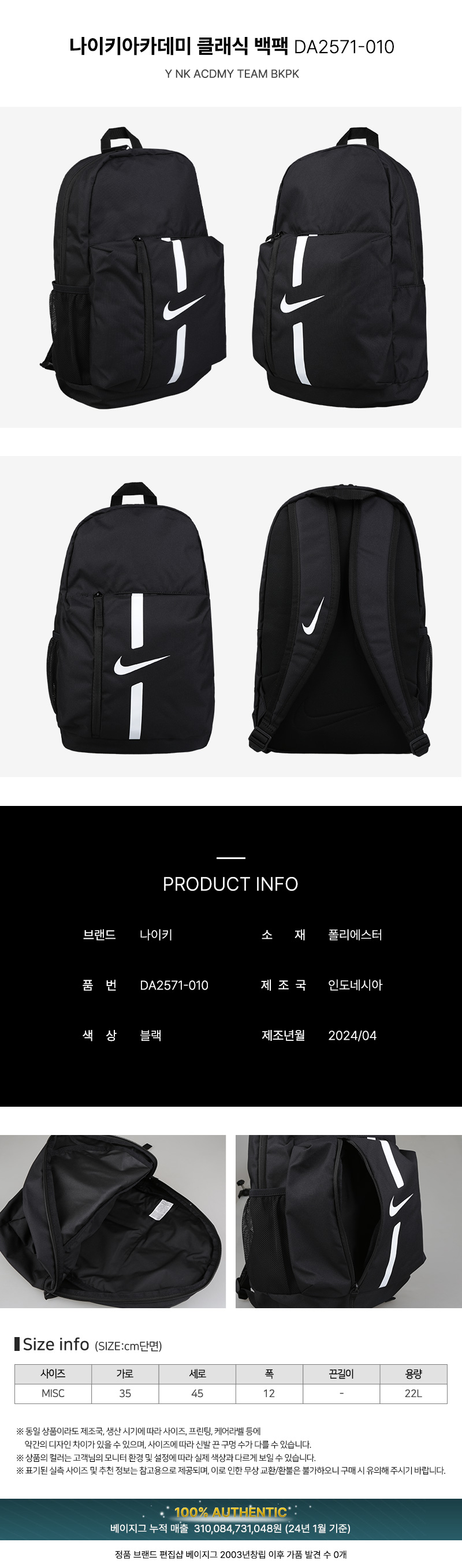 2025 SS나이키 아카데미 클래식 학생 백팩 운동 등산 가방 DA2571-010_