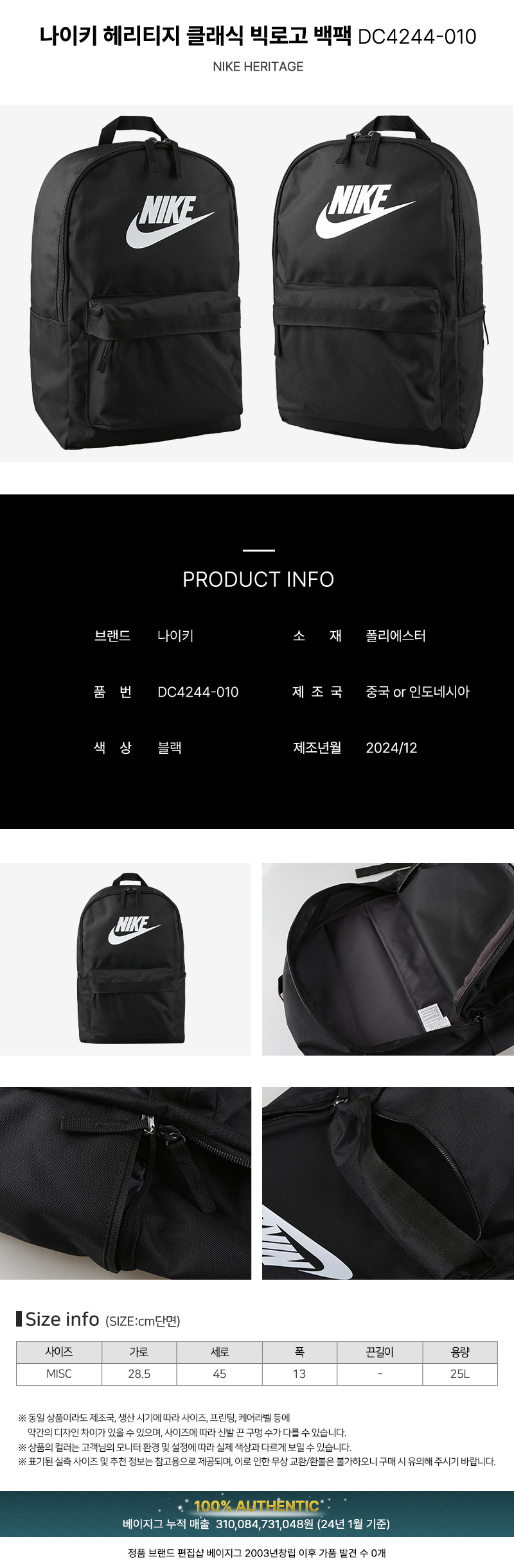 2025 SS나이키 헤리티지 클래식 빅로고 학생 백팩 운동 등산 가방 DC4244-010_
