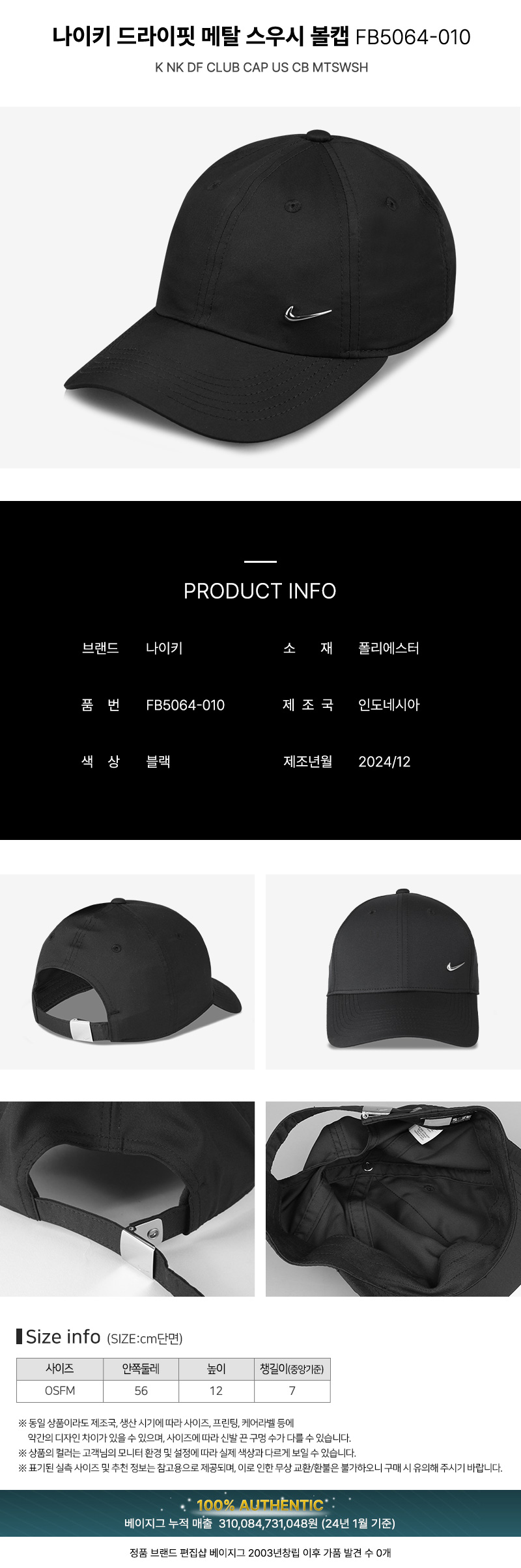 나이키 NIKE 드라이핏 메탈스우시 여성 야구 여행 모자 볼캡 FB5064-010
