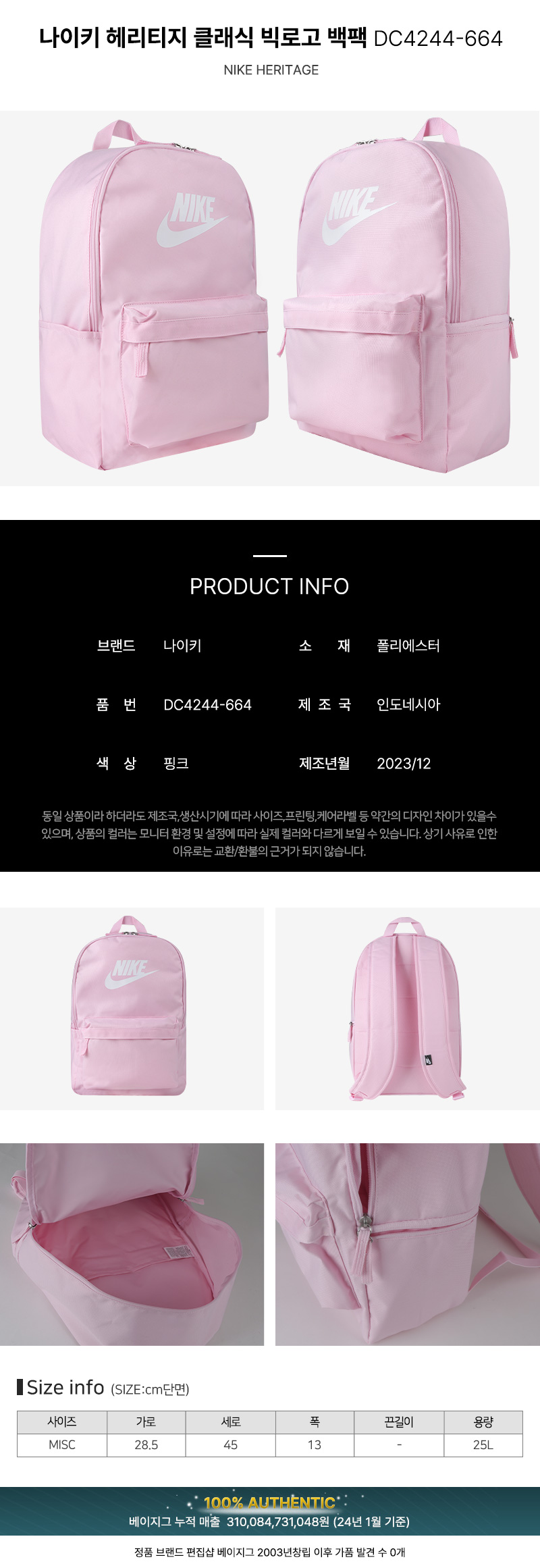2025 SS나이키 헤리티지 클래식 빅로고 학생 백팩 핑크 가방 DC4244-664