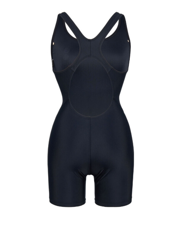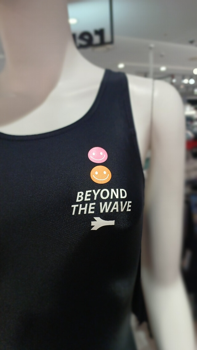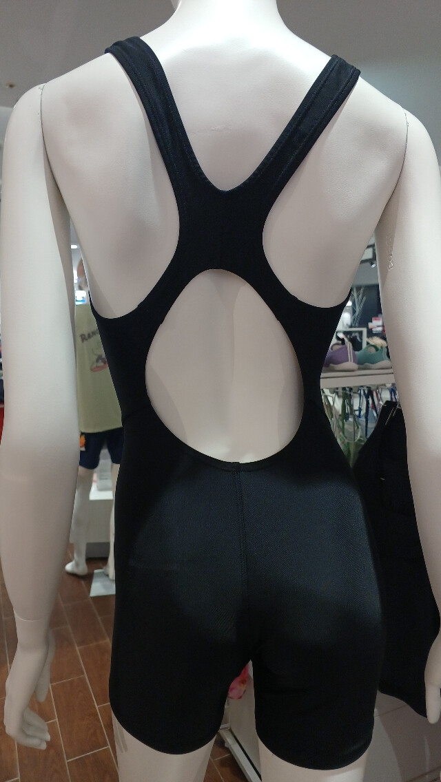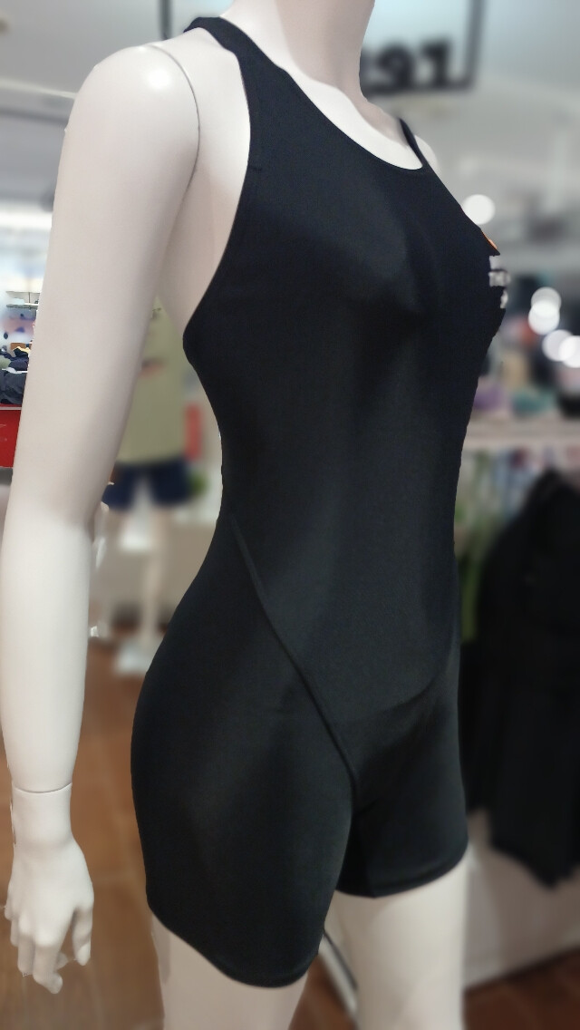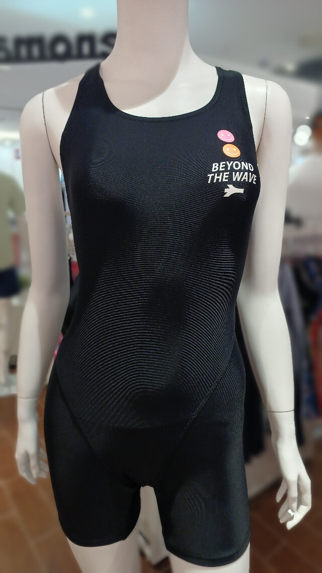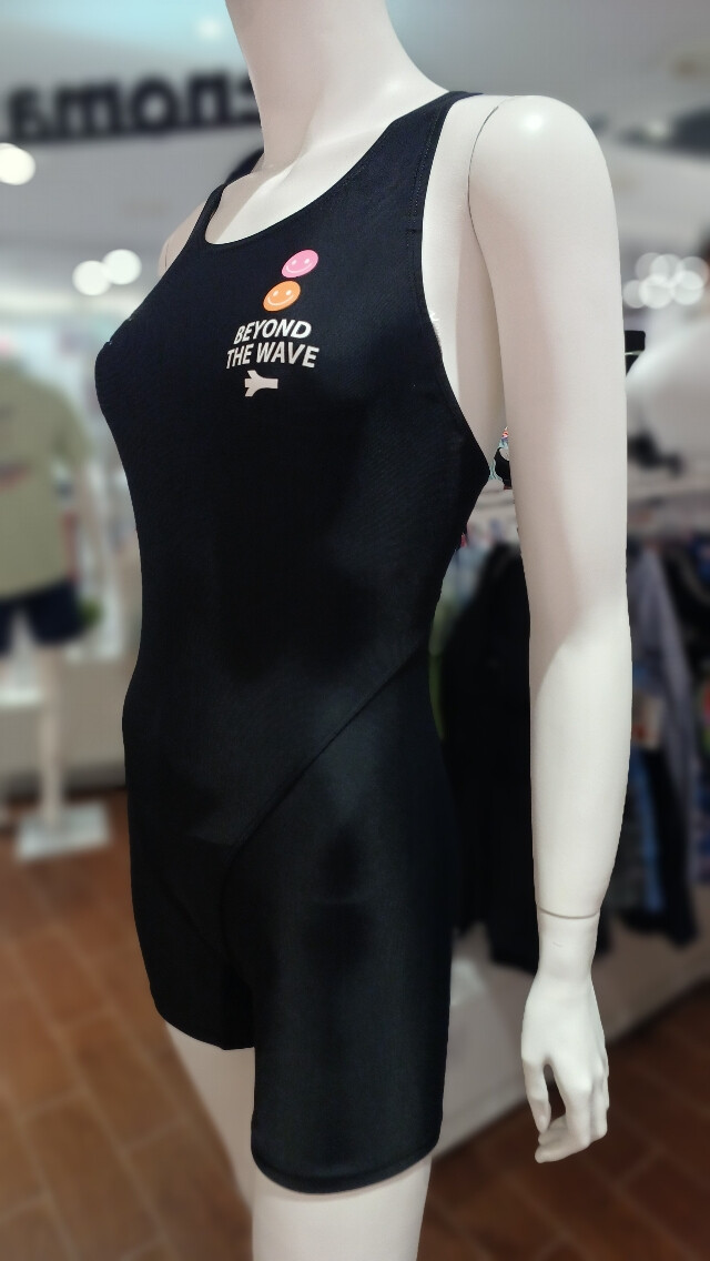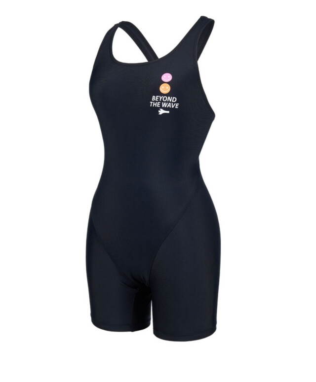 깔끔한 블랙 컬러에 스마일 프린트가 포인트이며 쫀쫀하게 잡아 주는 X백 2.5부 반신 원피스 수영복입니다 .