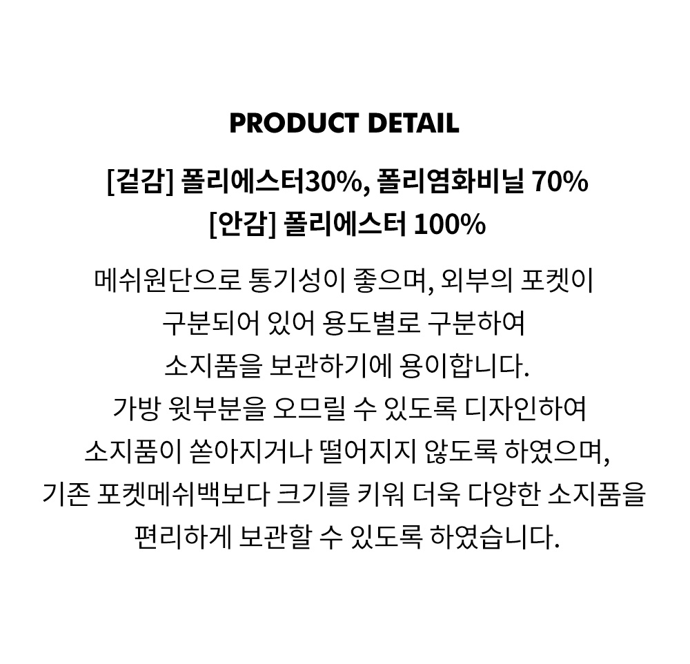 [겉감]폴리에스터30%, 폴리염화비닐 70% [안감]폴리에스터 100%
