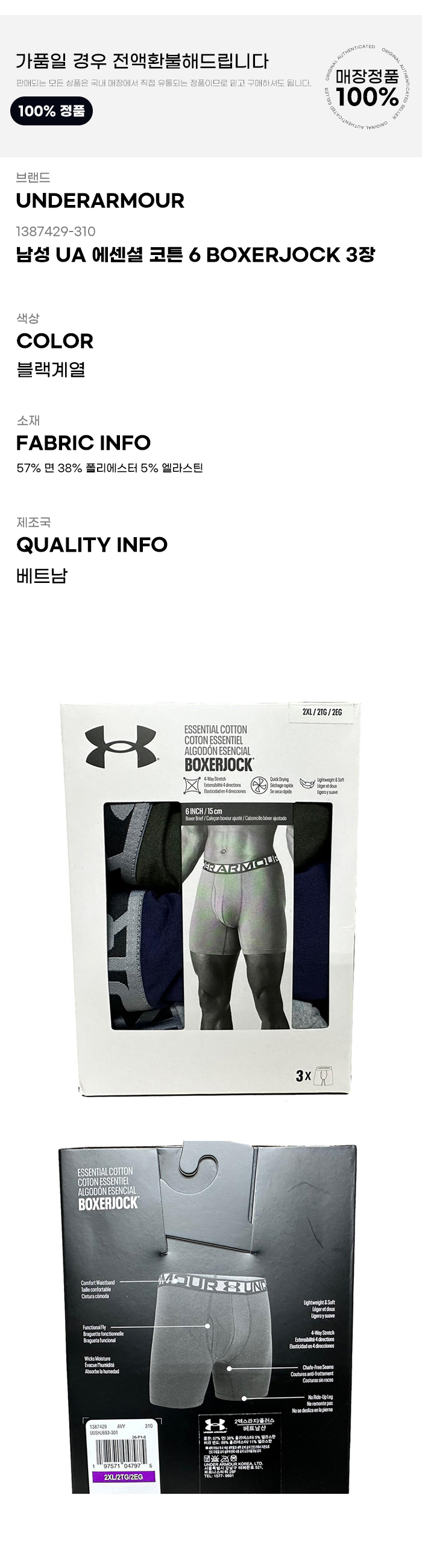 팬티 BQK 1387429-310 남성 UA 에센셜 코튼 6 Boxerjock 3장