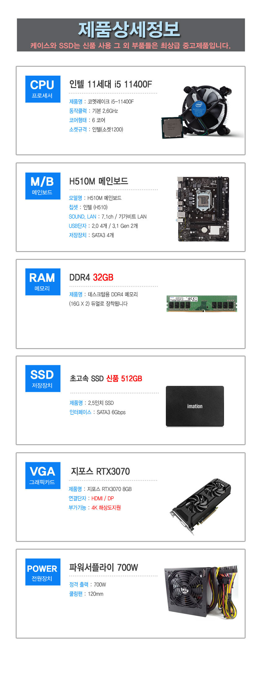 인텔i5-11400F/32G/RTX3070 게이밍 조립컴퓨터 윈도우포함 사은품 증정 멀티탭/스피커/패드 증정 A급 중고