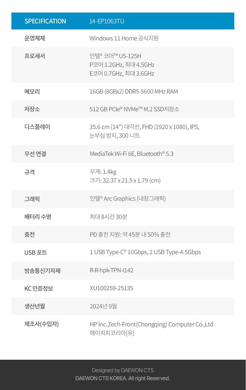 ND X HP 가성비 노트북 14-ep1063TU ( D5 16GB / NVMe 512GB / W11H ) 울트라5 125H