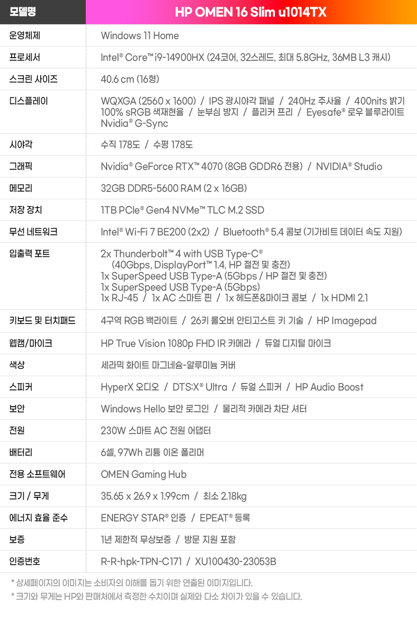 HP OMEN 16 slim u1014TX I9-14900HX/32GB/1TB/RTX4070/White/400nit_400hz_WQXGA/Win/Wifi7