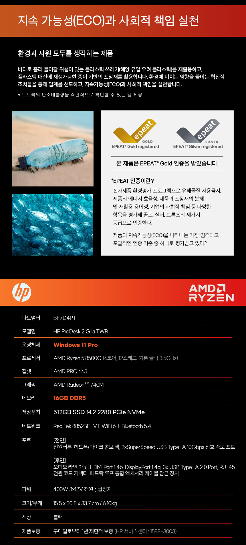 HP 프로데스크 2 타워 G1a BF7D4PT R5-8500G 16GB 512GB WIN11 / 가정용PC 사무용 인강용 산업용 데스크