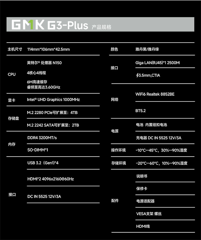 패키지 타입 : 10 듀얼 메쉬 G2 N100 준시스템 12G 메모리 하드디스크 없음 ![]() | 패키지 타입 : 11 듀얼 메쉬 G2 N100 12G 메모리 256G 솔리드 스테이트 ![]() | 패키지 타입 : 12 듀얼 메쉬 G2 N100 12G 메모리 512G 솔리드 스테이트 ![]() |