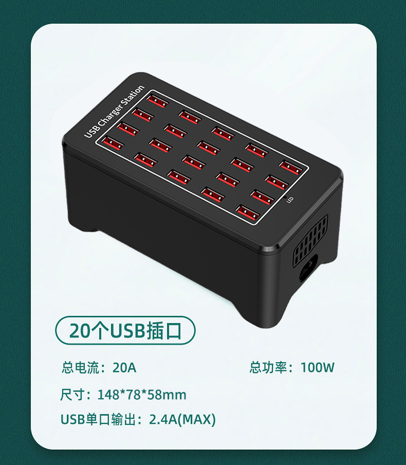 색상 분류 : 13 20구 충전기 A7 팬포함 100W (출력 5V/20A 총출력 100W) ![]() | 색상 분류 : 14 20구 충전기 A7 팬포함 100W +사과선 10개 ![]() | 색상 분류 : 15 20구 충전기 A7 팬포함 100W +안드로이드 10개 ![]() |