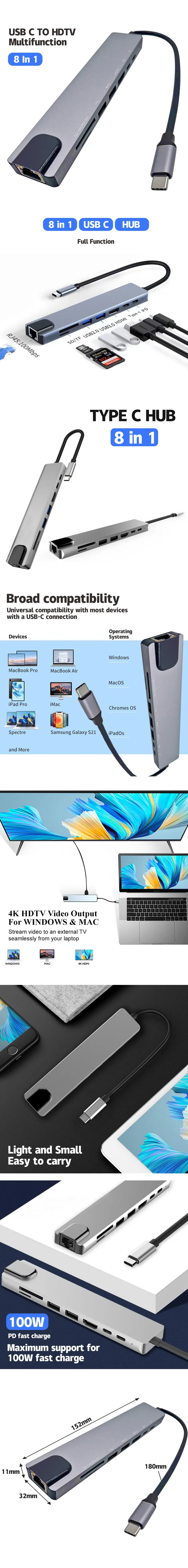 USB C 타입 허브 HD 4K 어댑터 RJ45 랜 이더넷 TF SD 리더 USB C 3.0 타입 C 도킹 스테이션 노트북 8 인