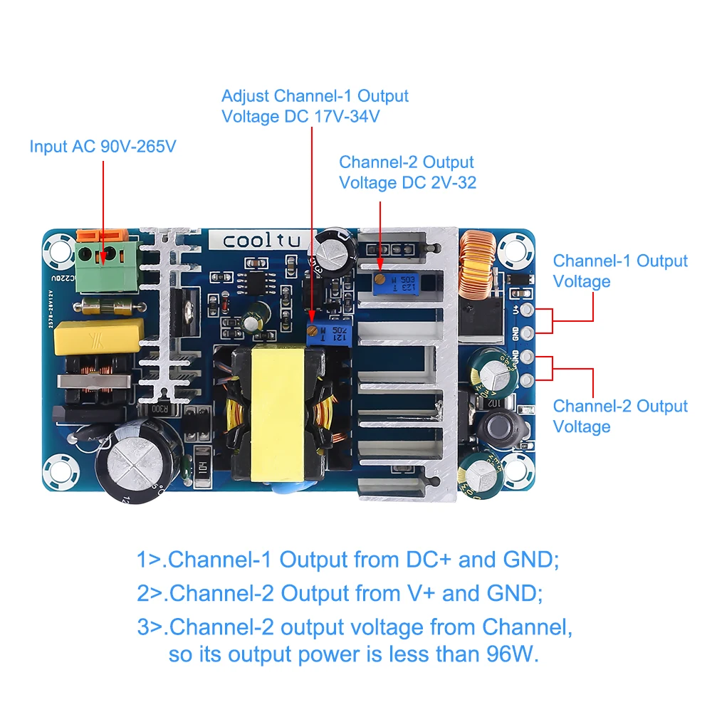 1>.Input 전압: AC90-265V 2>. 채널-1 출력 전압: DC 17V-34V 4A 3>. 채널-2 출력 전압: DC 2V-32V 5A 4>. 출력 전력: 100W 5>. 과전류 보호: 예 6>. 단락 보호: 예 7>. 과부하 보호: 예 8>. 작업 주파수: 50Hz/60Hz 9>. 리플 소음:<200mV 10>. 작동 온도:-20 ℃ ~ 85 ℃ 11>. 작동 습도: 5% ~ 95% RH 12>. 모듈 크기: 106*57*30mm 참고: 1>. 채널-DC 및 gnd에서 1 출력; 2>. 채널-V 및 gnd에서 2 출력; 3>. 채널-2 출력 전압 채널에서 출력 전력은 96W 미만입니다. Appliction: 1>. 산업 자동화 2>. 과학 연구 장비 3>.LED 조명 4>. 공기 정화 5>. 민간 장비