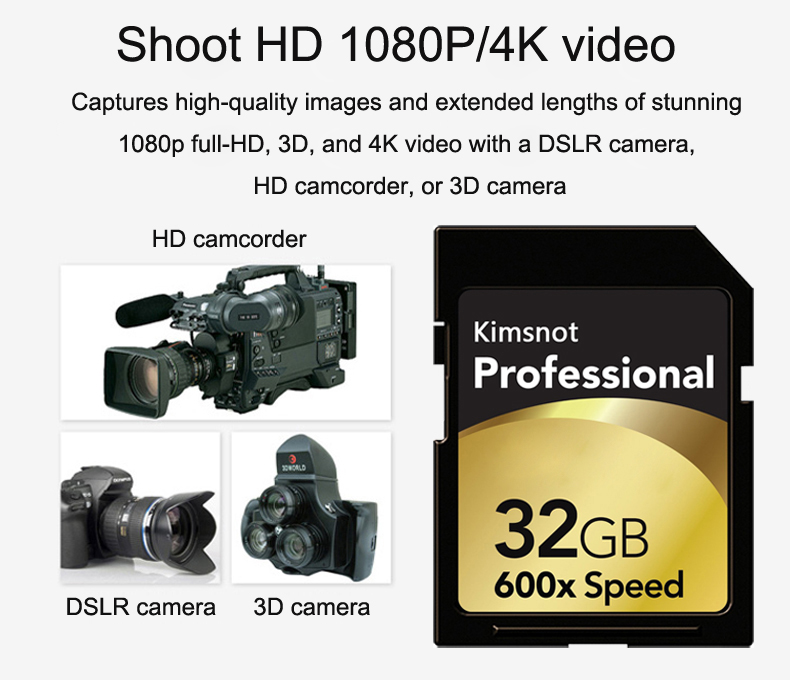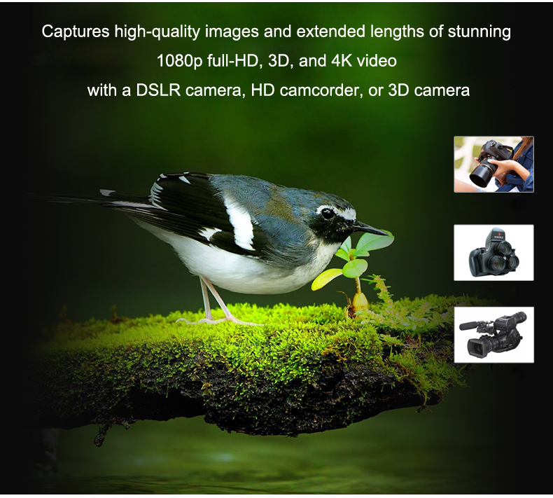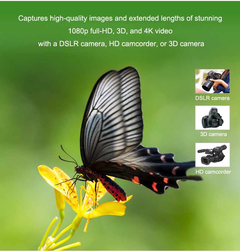 * DSLR 카메라, HD 캠코더 또는 3D 카메라로 고품질 이미지와 멋진 1080p 풀 HD,3D 및 4K 비디오의 확장 된 길이를 캡처하십시오