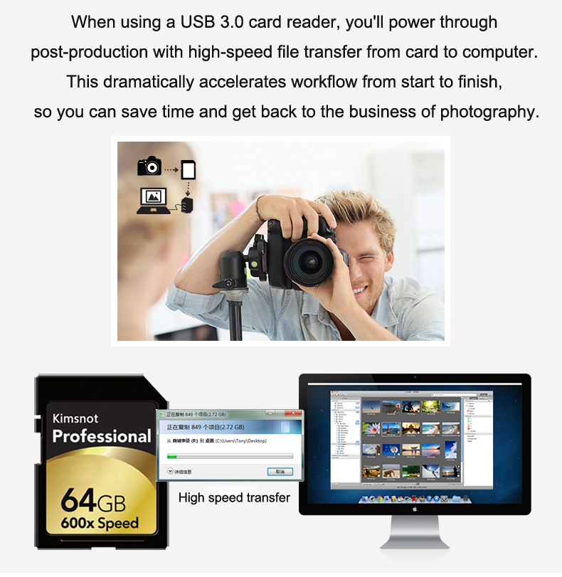 * 워크 플로를 크게 가속화하기 위해 카드에서 컴퓨터로 고속 파일 전송