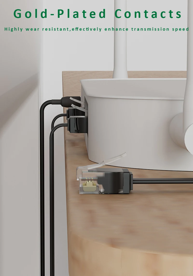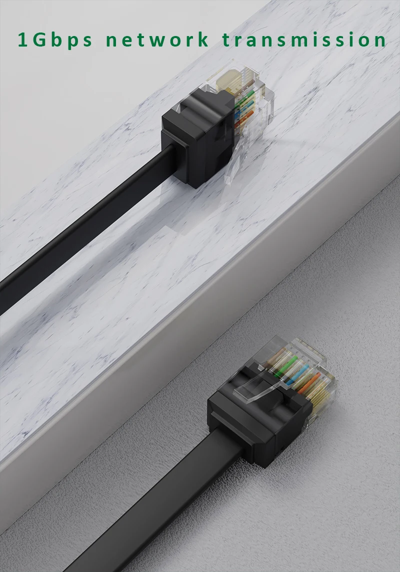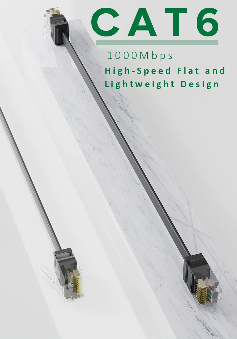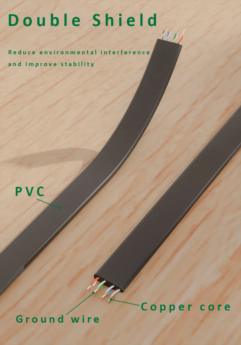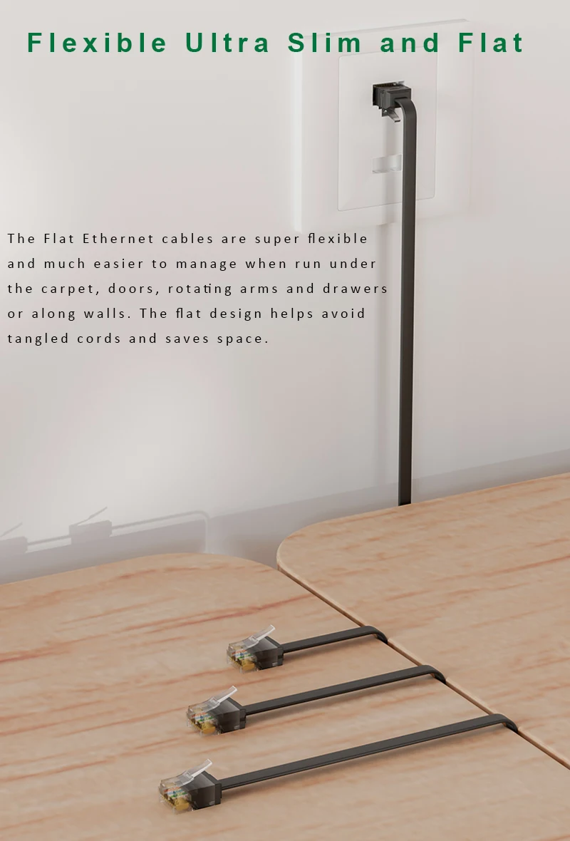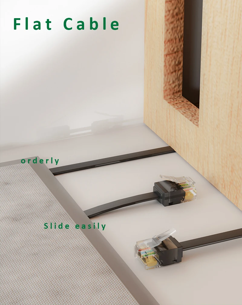 플랫 이더넷 케이블은 매우 유연하며 카펫, 문, 회전 암 및 서랍 아래 또는 벽을 따라 달릴 때 관리가 훨씬 쉽습니다. 평면 디자인은 얽힌 코드를 피하고 공간을 절약합니다.