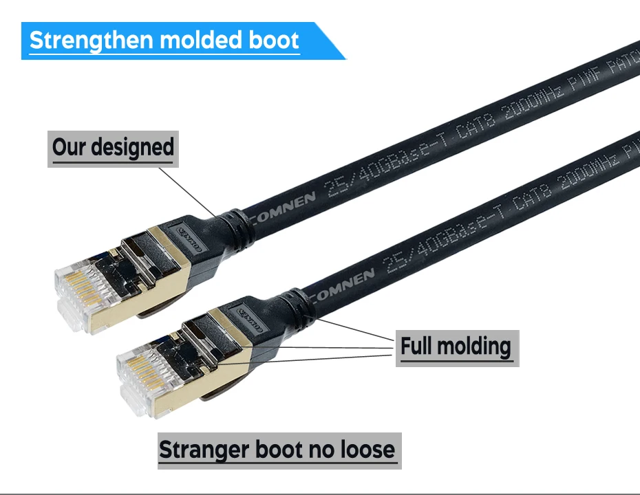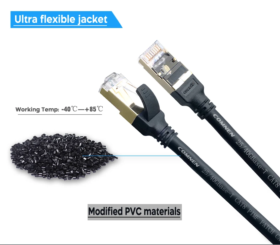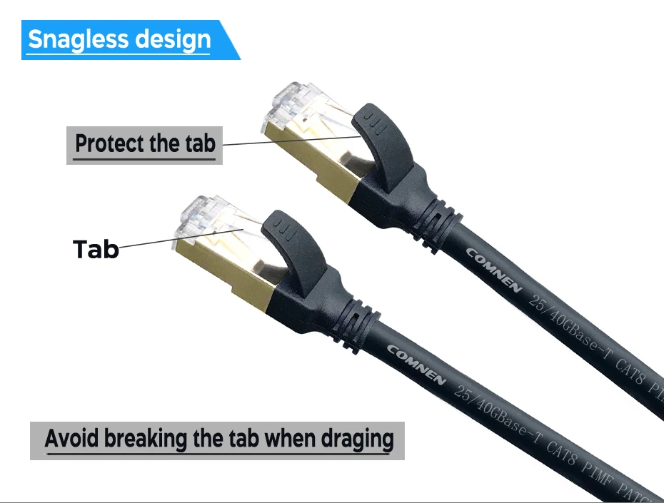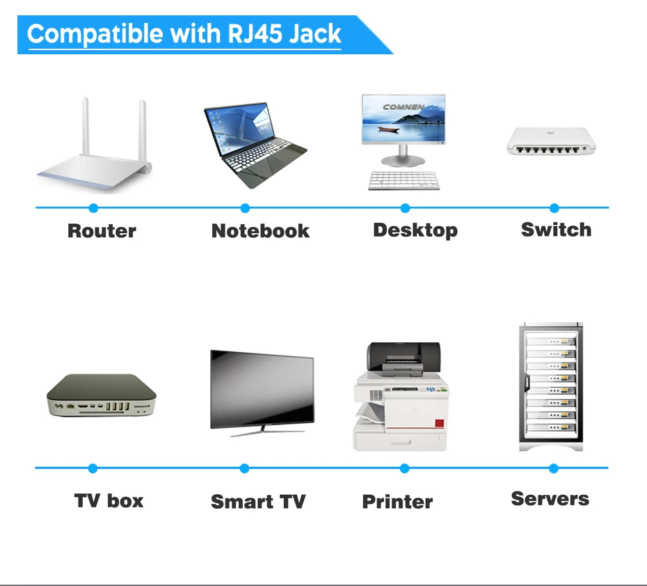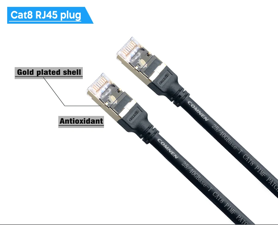 RJ45 커넥터를 사용하면 Cat 8 이더넷 케이블을 컴퓨터, 노트북, 모뎀, 라우터, PS5, PS4, PS3, X-Box 360, X-Box One, 스위치, 네트워크 어댑터 및 기타 네트워킹 장치. 또한 Cat7, Cat6e, Cat6, Cat5e, Cat5 와 완전히 호환 될 수 있습니다.