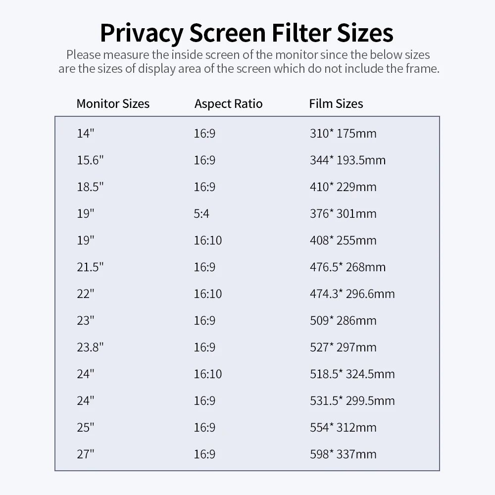 이 개인 정보 보호 스크린 필터는 매트 마감 표면이 눈부심 방지와 높은 투과율로 색상을 복원하여 되돌릴 수 있습니다. 또한 각도 (≥ 30 °) 에서 볼 때 화면이 어두워집니다. 또한 자외선을 차단하여 눈을 보호하고 눈의 피로를 어느 정도 덜어줍니다.