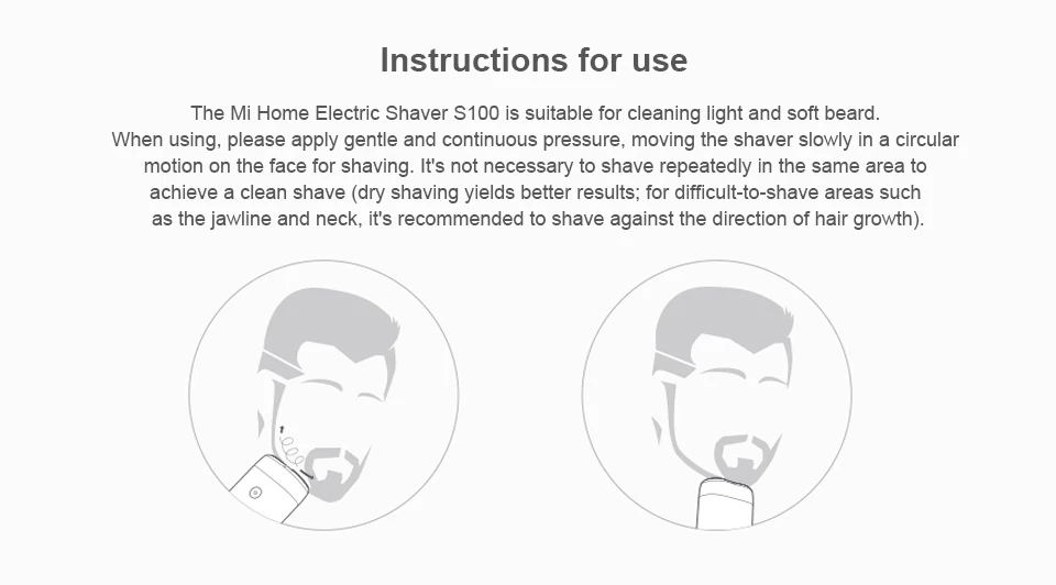 Mi Home 전기 면도기 S100 은 가볍고 부드러운 수염을 청소하는 데 적합합니다. 사용 시 면도를 위해 면도기를 얼굴에 원을 그리면서 천천히 움직여 부드럽고 지속적인 압력을 가해 주십시오. 깨끗한 면도를 위해 같은 부위에서 반복적으로 면도 할 필요는 없습니다 (건식 면도는 더 나은 결과를 가져옵니다. 턱선 및 목과 같이 면도하기 어려운 부위의 경우, 모발 성장 방향에 대해 면도하는 것이 좋습니다).