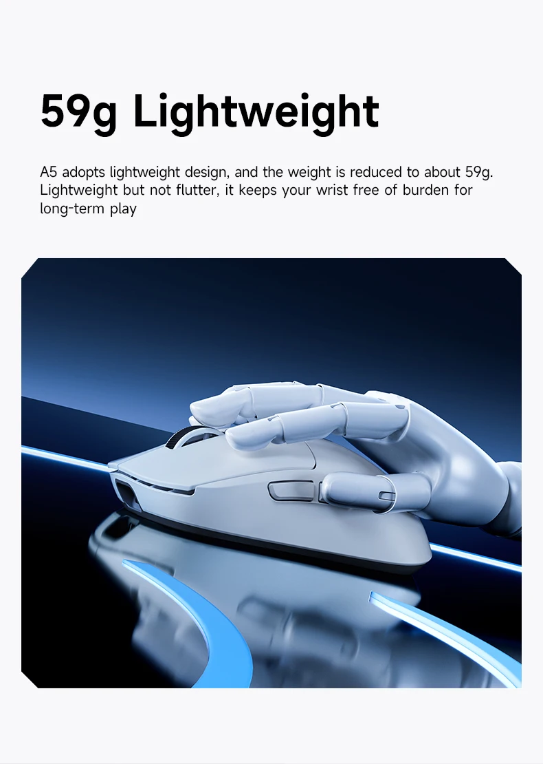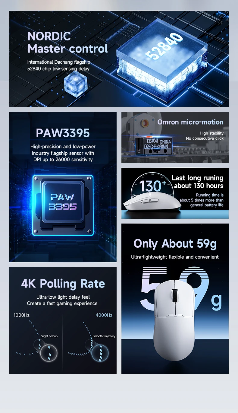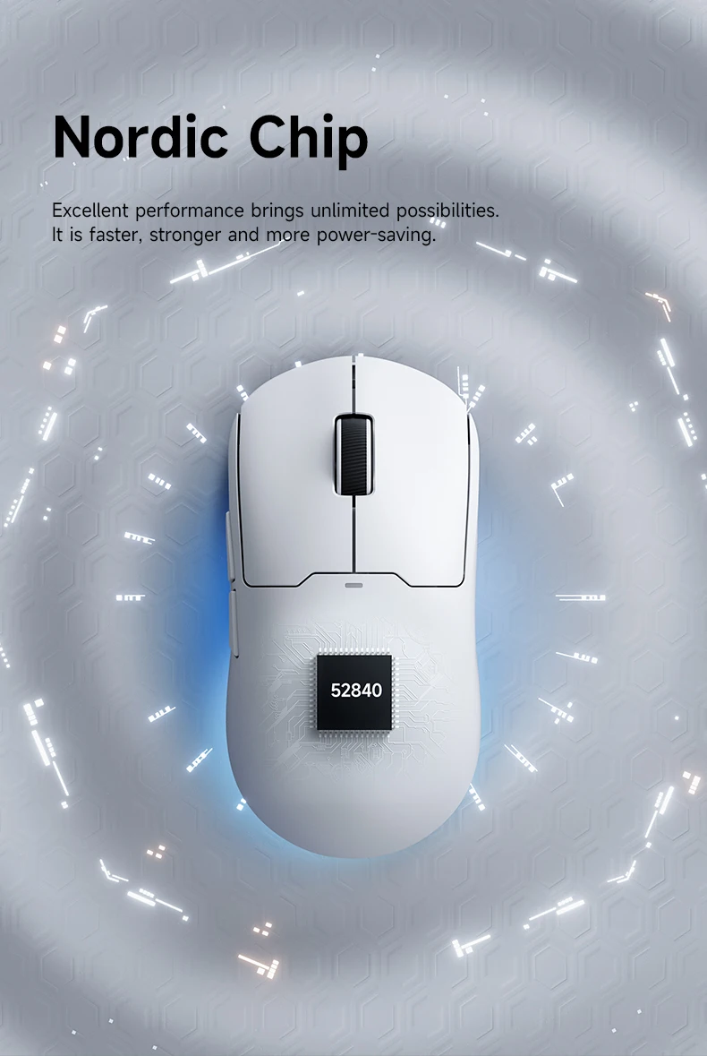 Nordic 마스터 제어 칩 + PAW3395는 0.25ms 미만의 대기 시간을 보장하여 99% 무선 마우스보다 성능이 뛰어납니다.