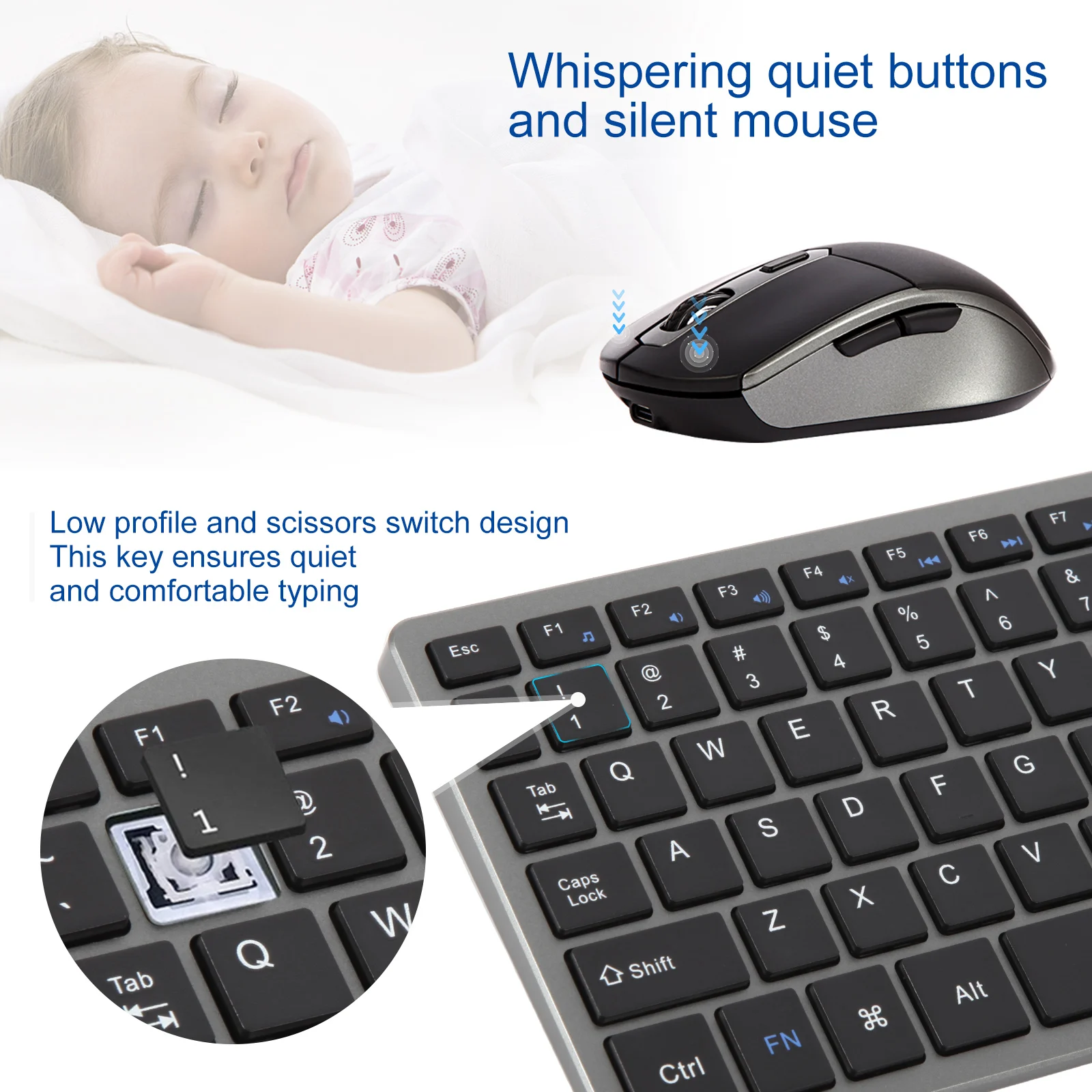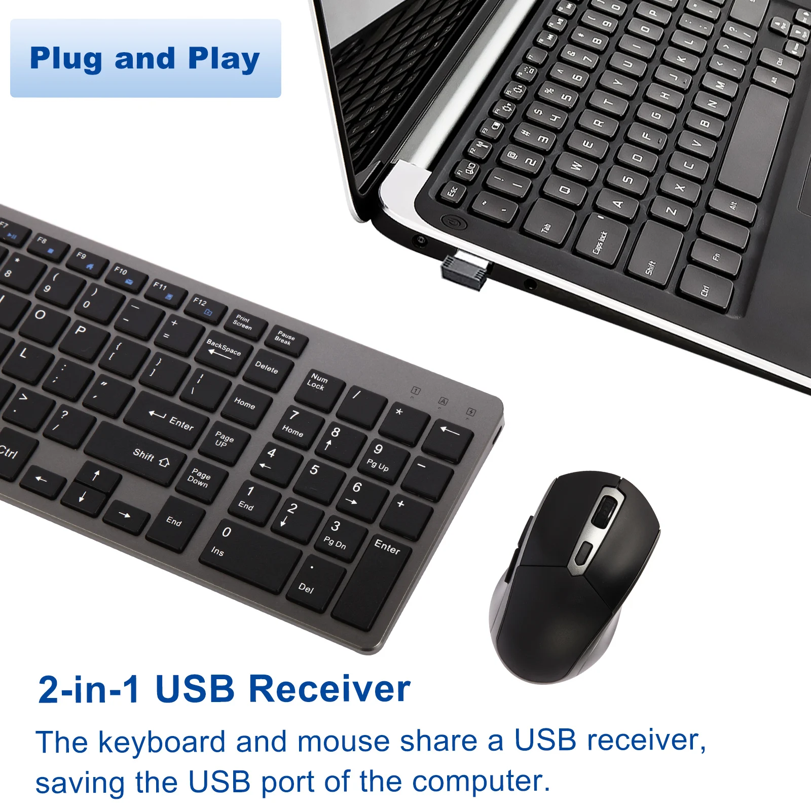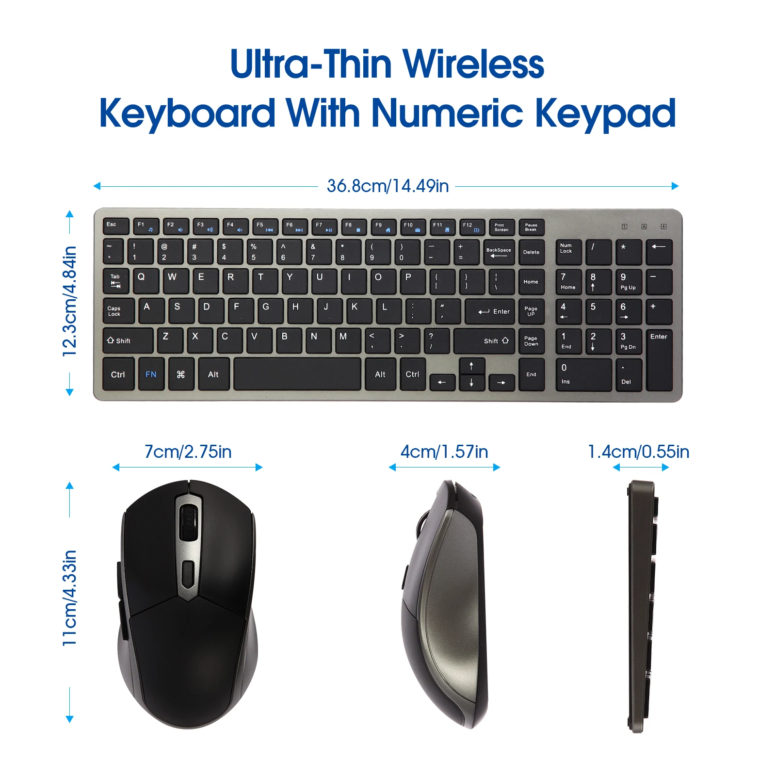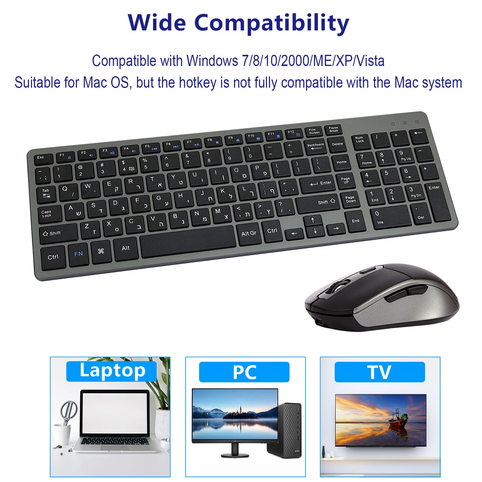 【넓은 호환성】-이 충전식 키보드 마우스 콤보는 PC, 데스크탑 컴퓨터, 노트북 또는 노트북에서 작동하며 Windows 7/8/10/11/XP/Vista 시스템과 호환됩니다. 키보드 및 마우스는 macOS/iOS/Android/Chrome OS/Linux에서도 사용할 수 있지만 Fn 멀티미디어 기능 키가 작동하지 않을 수 있습니다.