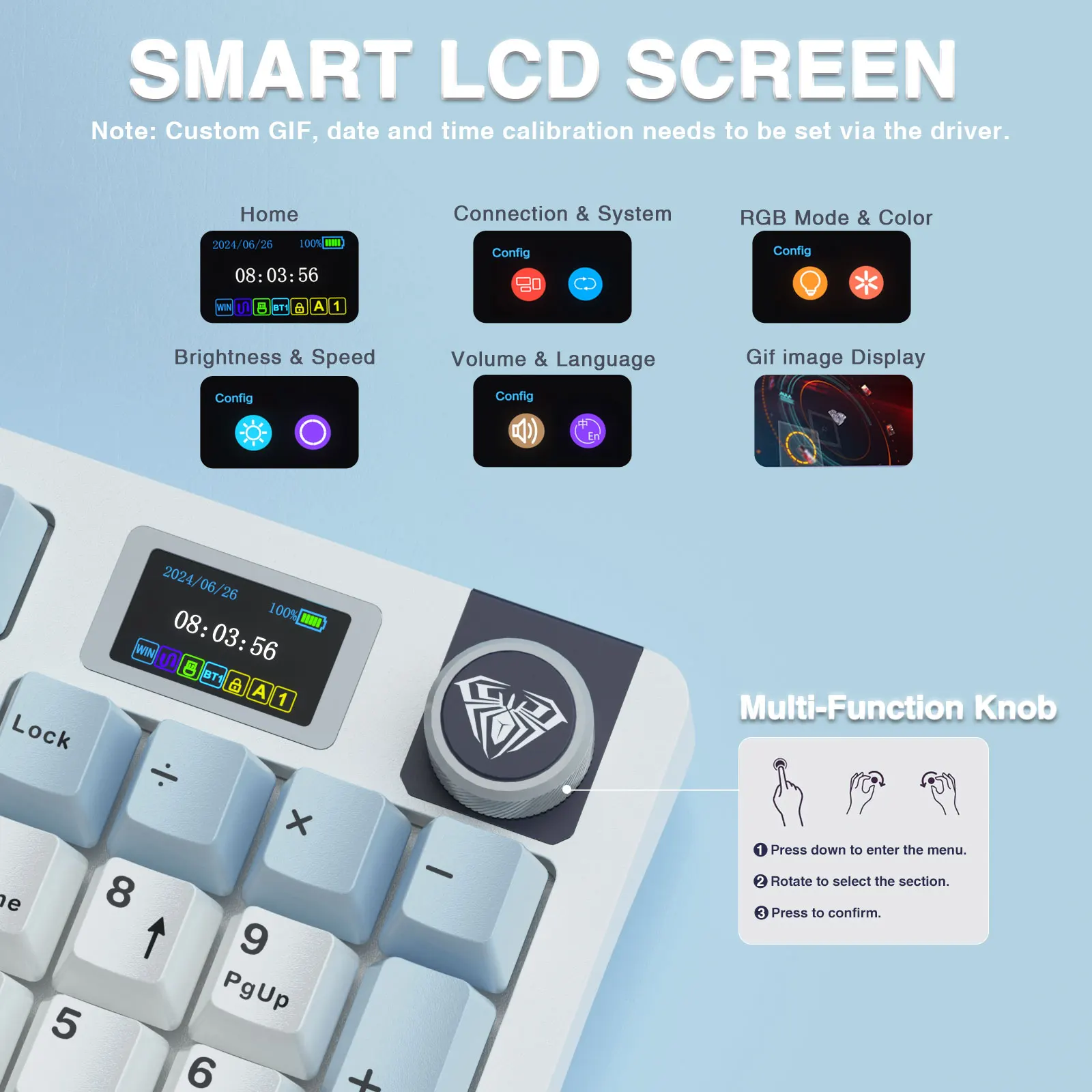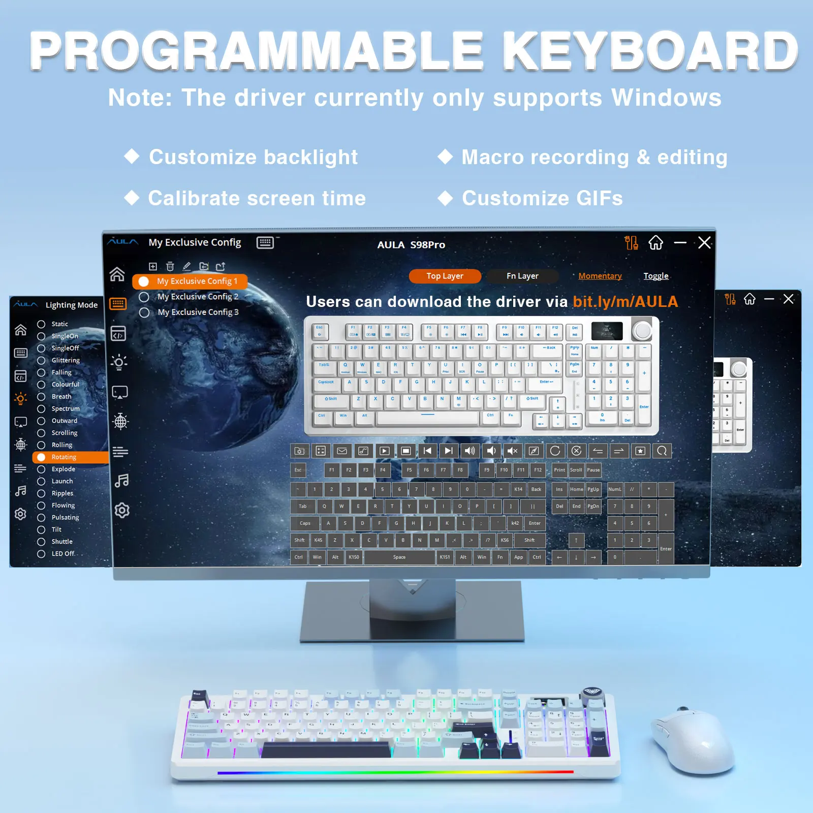 AULA S98pro 개스킷 장착형 트리플 모드 기계식 키보드, TFT 스크린 및 노브가 있는 게임용 키보드