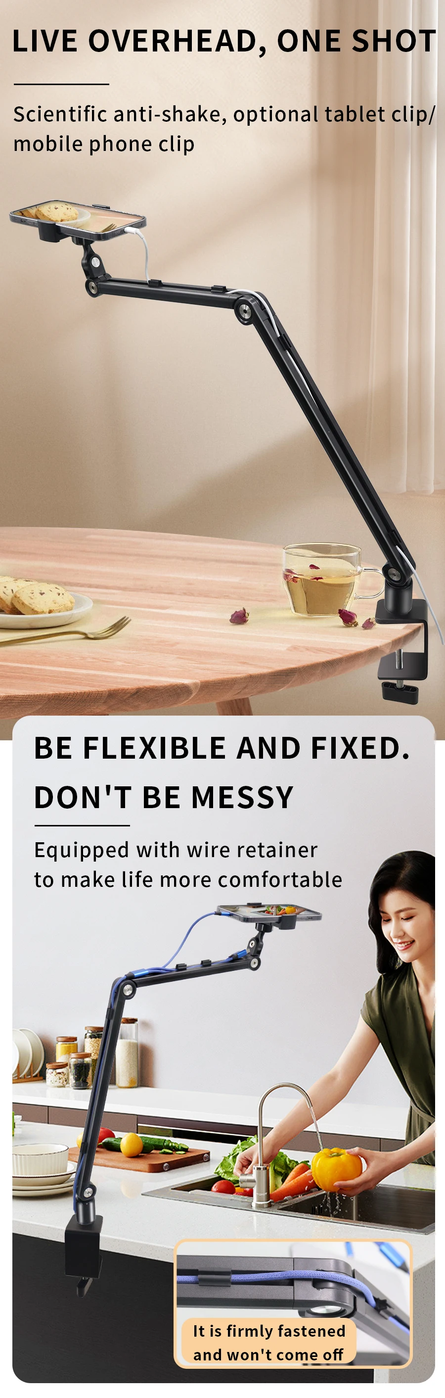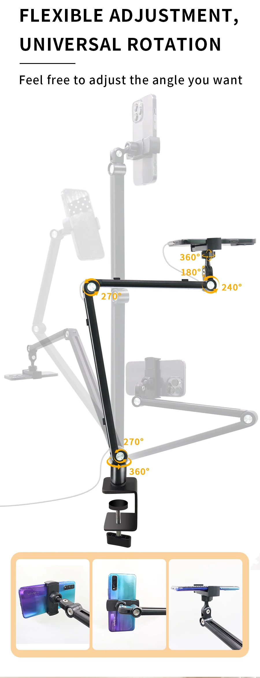 -Ipad용 스탠드는 여러 부품 조정, 하단 360 도 회전, 팔 관절 270 도 조절 가능, 화면 회전 각도 360 도 지원 합니다. 앉거나 서 있거나 누워있을 때 조절 기능으로 몸을 덮을 수 있습니다.