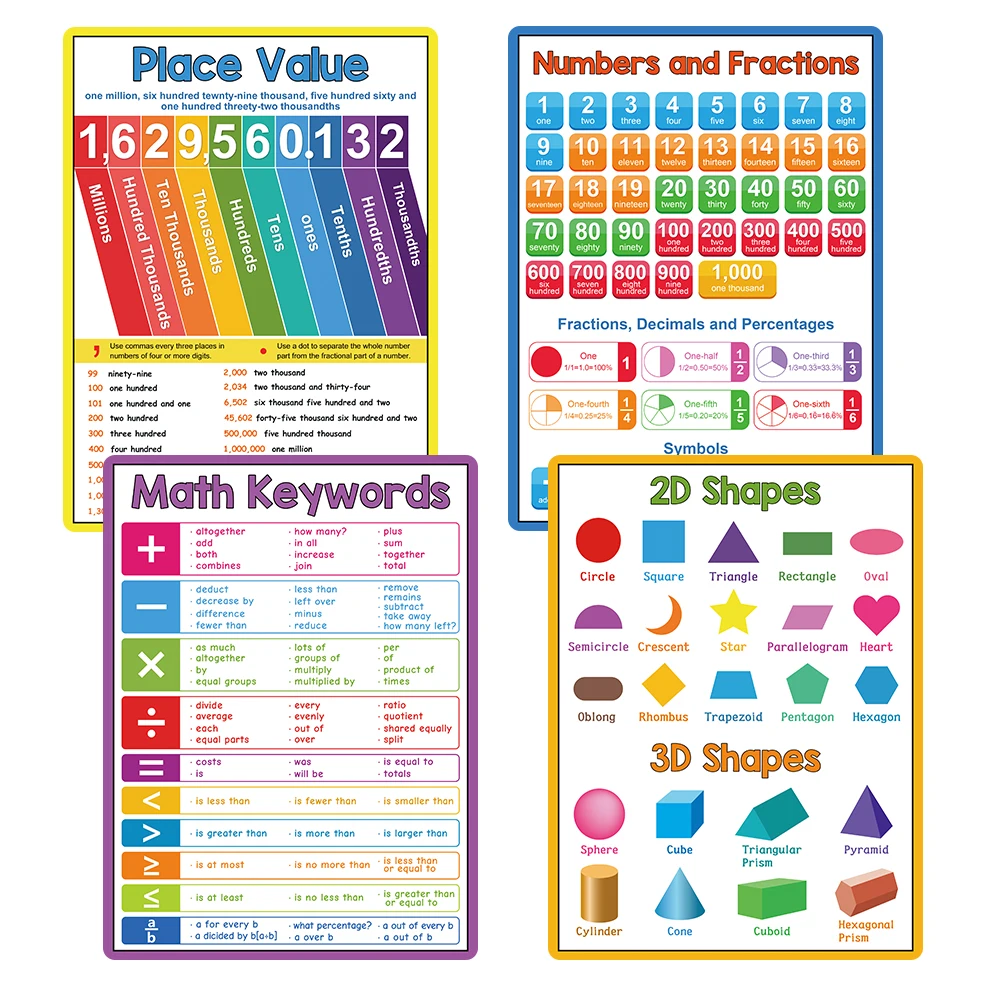스타일 H: 4 포스터-숫자 및 분수/장소 값/수학 키워드/2D 및 3D 모양