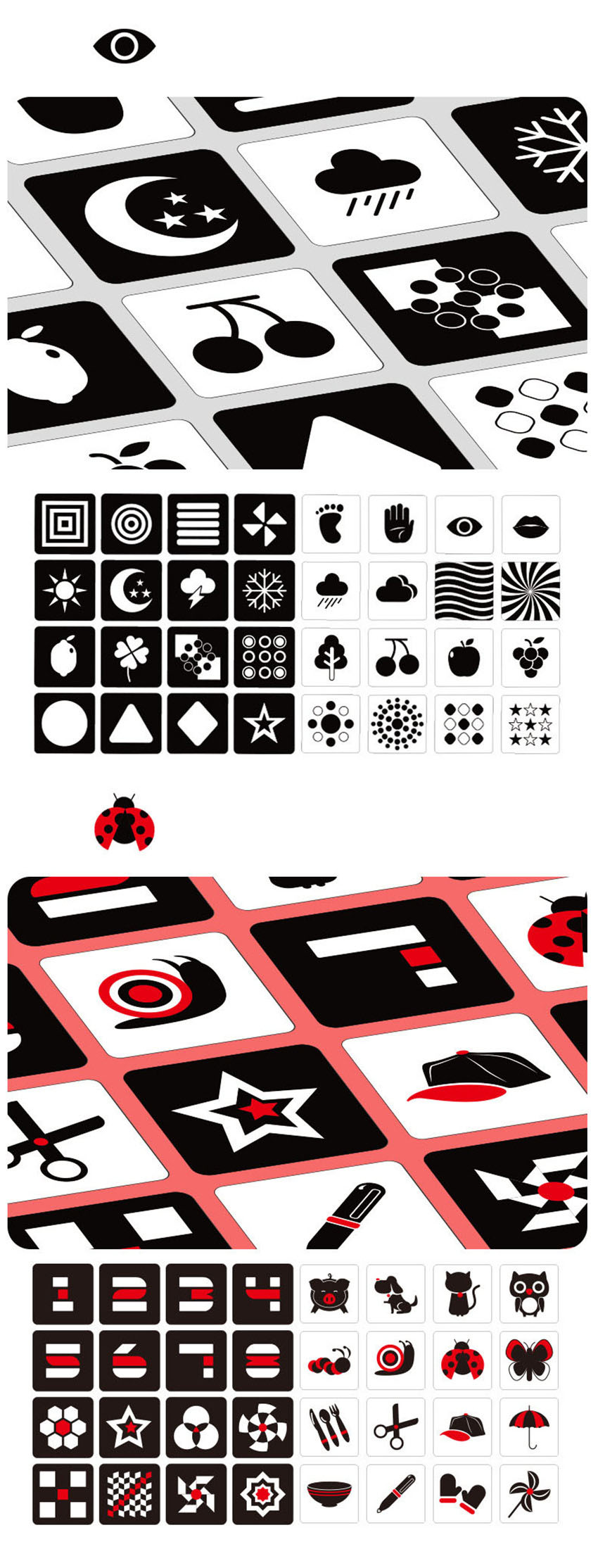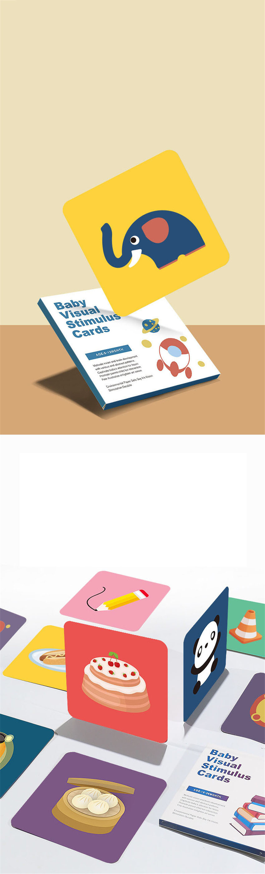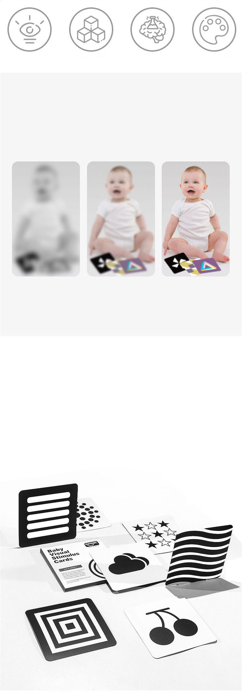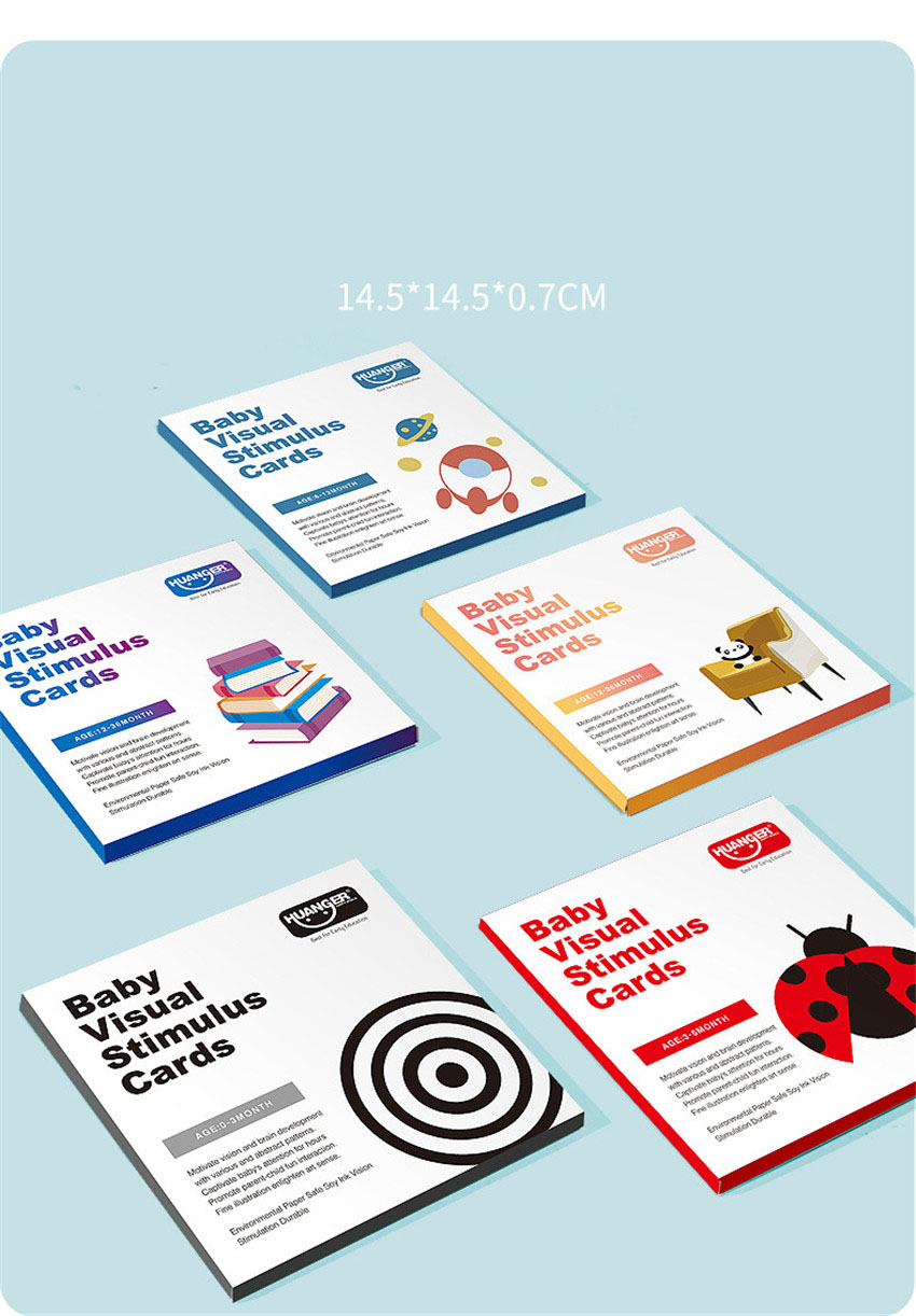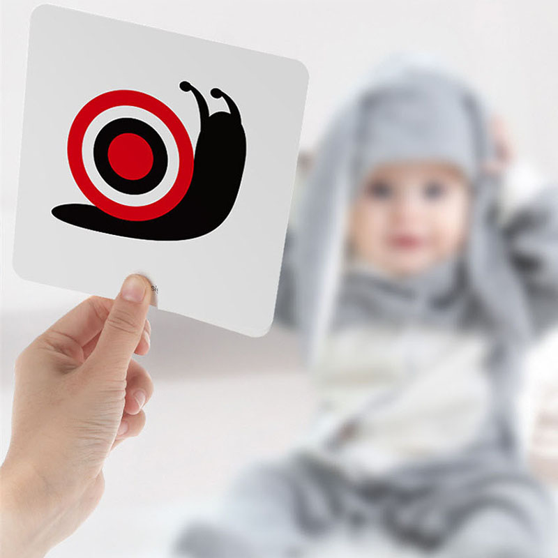 양면의 대형 카드는 두꺼운 판지로 제작되었으며 아기의 시각에 따라 대조되는 그림을 선사합니다.