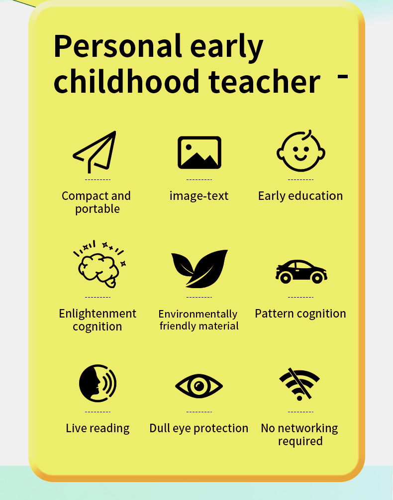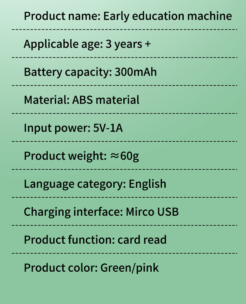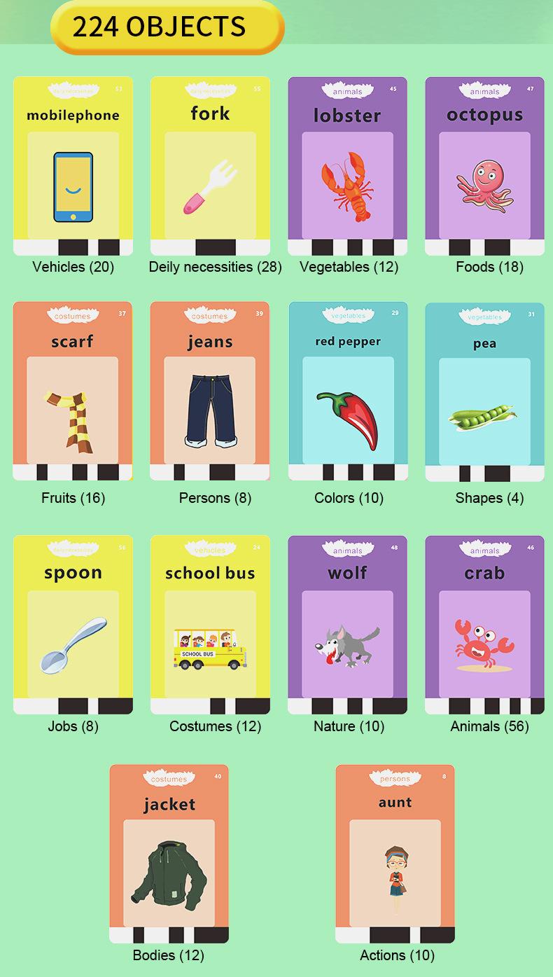 주요 기능: 계몽 조기 교육, 6세 미만 어린이에게 적합, 카드 112개, 총 224단어 장착