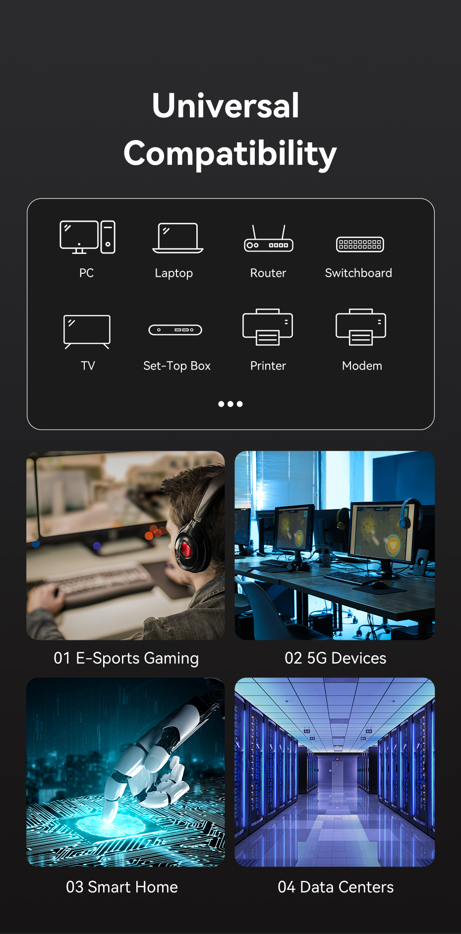 이 RJ45 이더넷 케이블은 라우터, 모뎀, 인터넷 연결을 포함한 다양한 장치와 호환되어 다양한 용도로 사용할 수 있습니다.