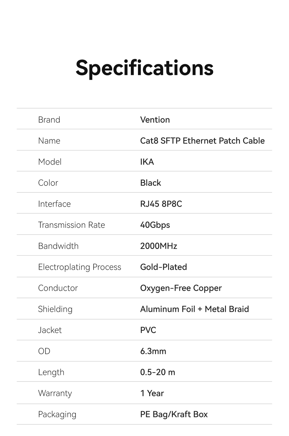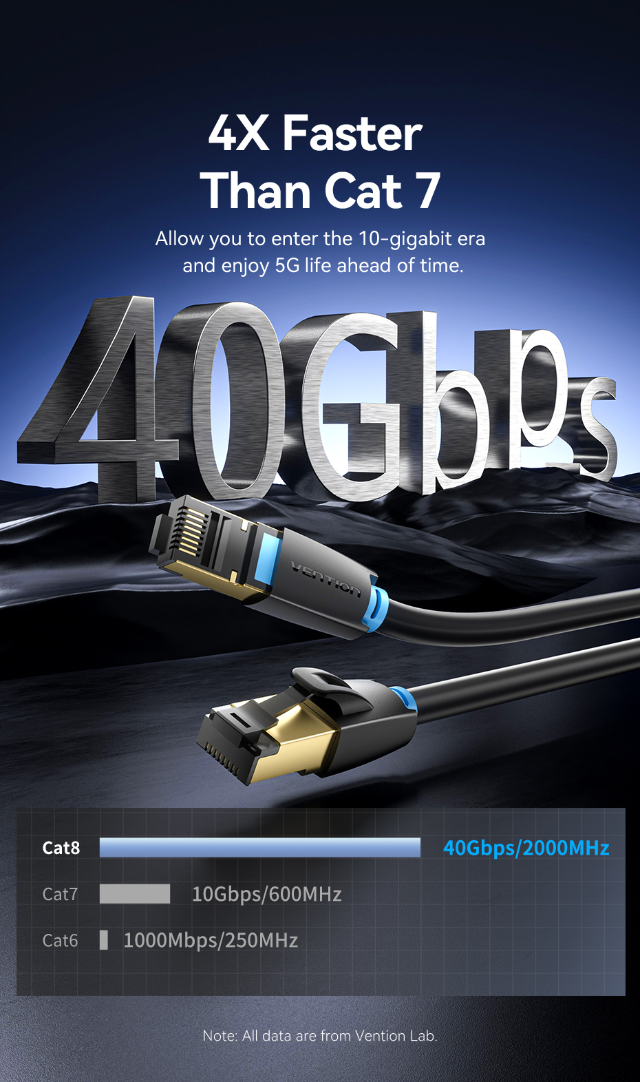 Vention으로 초고속 데이터 전송 속도를 경험해 보세요.Cat8 이더넷 케이블, 놀라운 것을 자랑합니다40Gbps 및 2000MHz능력.