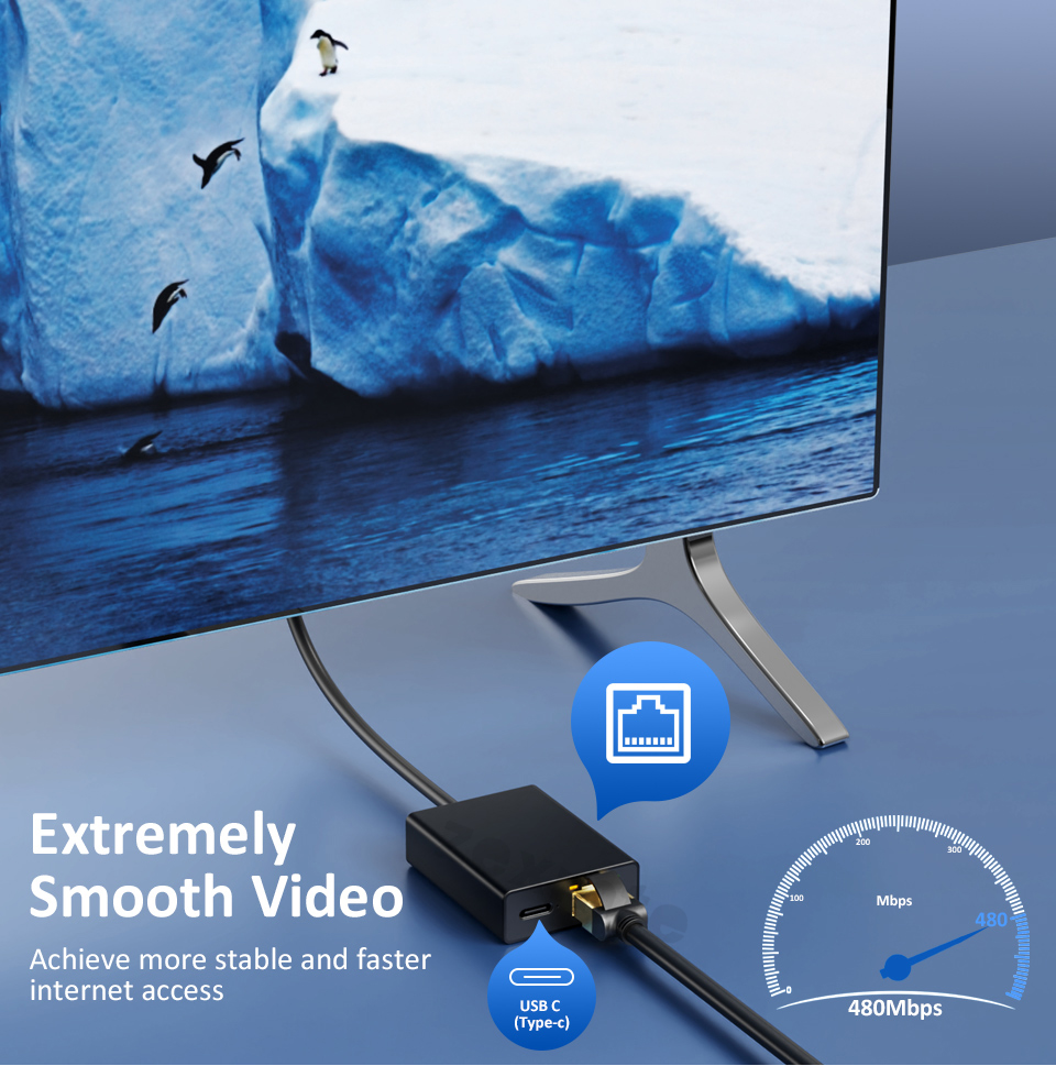 ● USB C-RJ45 네트워크 어댑터는 전송을 위한 전체 10/100mbps 이더넷 속도를 제공하여 더 빠르고 안정적인 인터넷 액세스를 제공합니다.참고: USB C 인터페이스는 전원 공급 전용이며 비디오 및 데이터를 출력하는 데 사용할 수 없습니다.