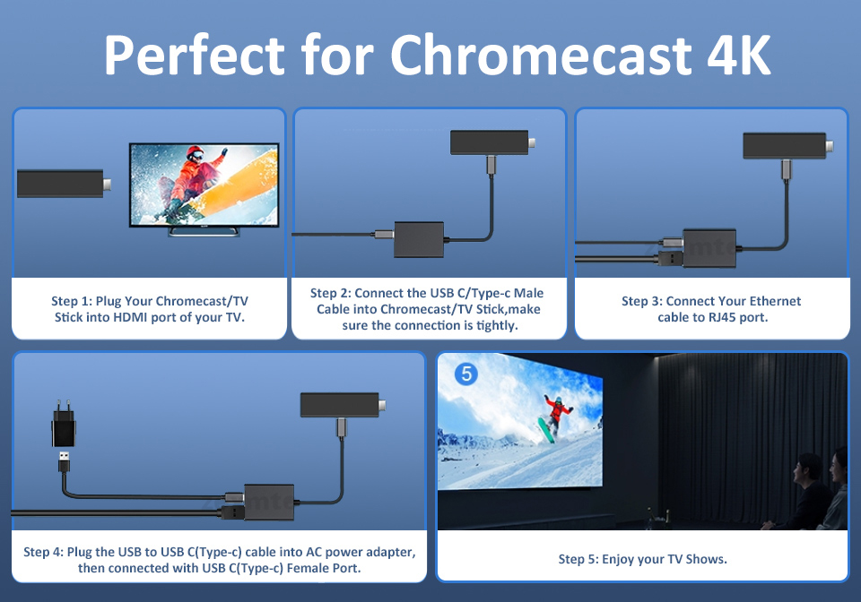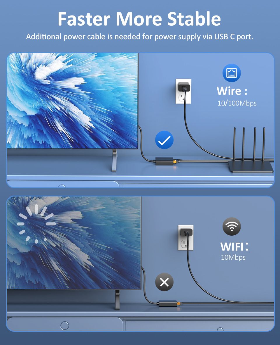 ● Chromecast Google TV가 불안정한 신호로 WIFI에 연결된 경우 이더넷 어댑터를 사용하면 보다 안정적이고 빠른 인터넷 액세스를 효과적으로 얻고 약한 WIFI 신호 문제를 해결할 수 있습니다.