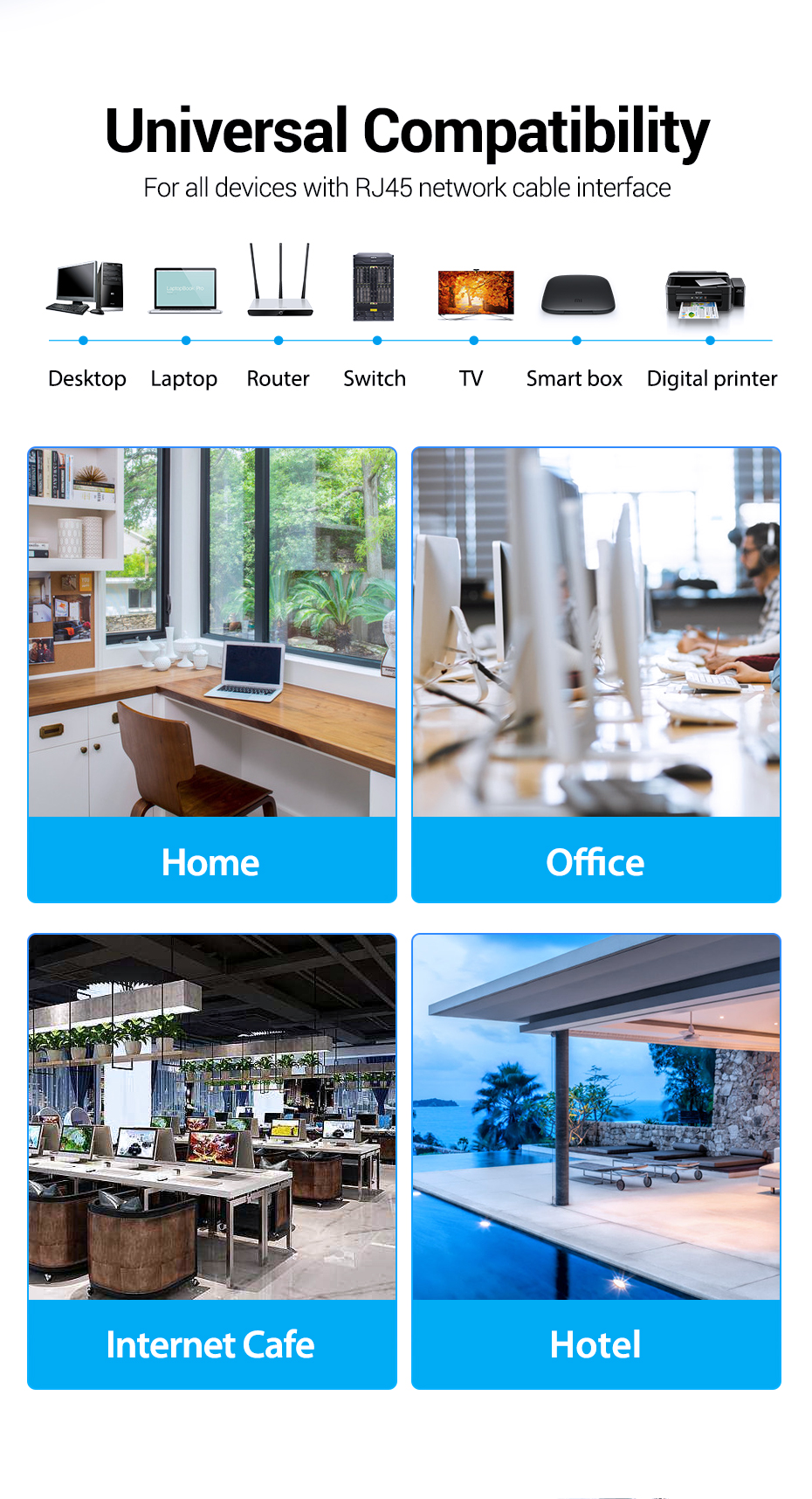 1) 고성능 Cat6, 26 AWG, UL 인증, RJ45 이더넷 패치 케이블은 PC, 컴퓨터 서버, 프린터, 라우터, 스위치 박스, 네트워크 미디어 플레이어, Xbox, PS, 게임, PoE 장치와 같은 LAN 네트워크 구성 요소에 대한 범용 연결을 제공합니다. NAS, VoIP 전화